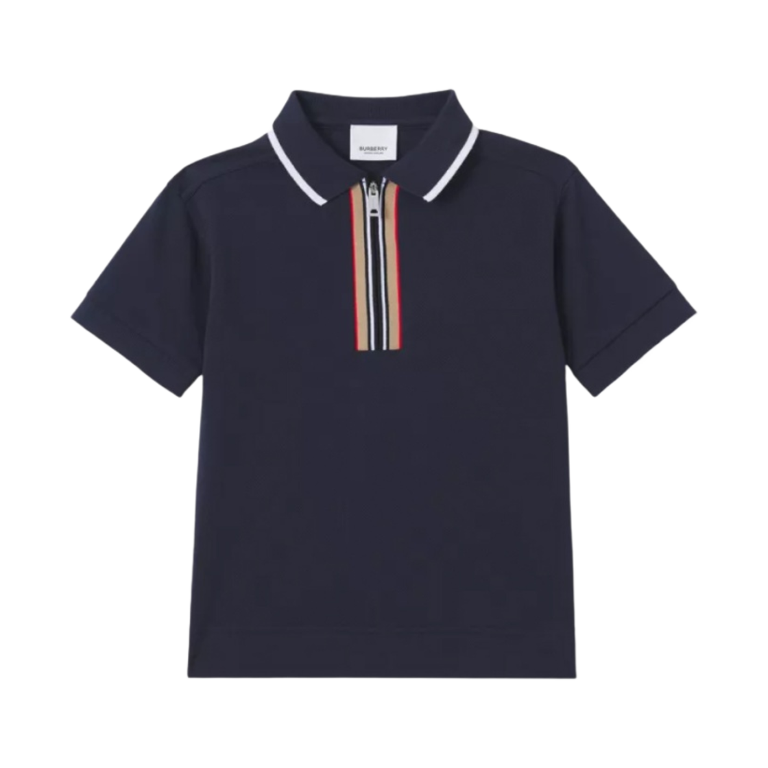 (Kids) Burberry Icon Stripe Detail Cotton Zip Front Polo Shirt Midnight