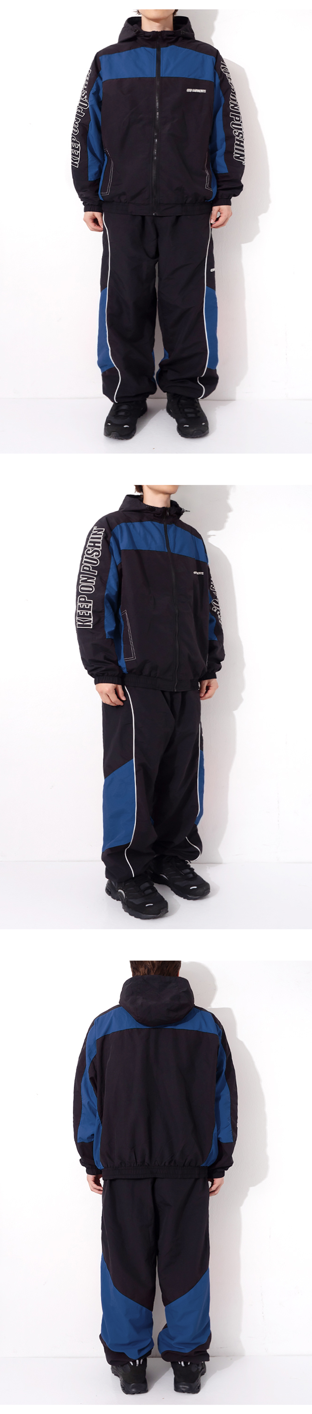 레트로한 컬러웨이의 트랙 셋업입니다. 부드러운 나일론 소재와 안감 메쉬를 활용하여 편안한 착용감이 특징인 제품입니다. 셋업 상품으로 스포티한 무드를 연출할 수 있습니다.