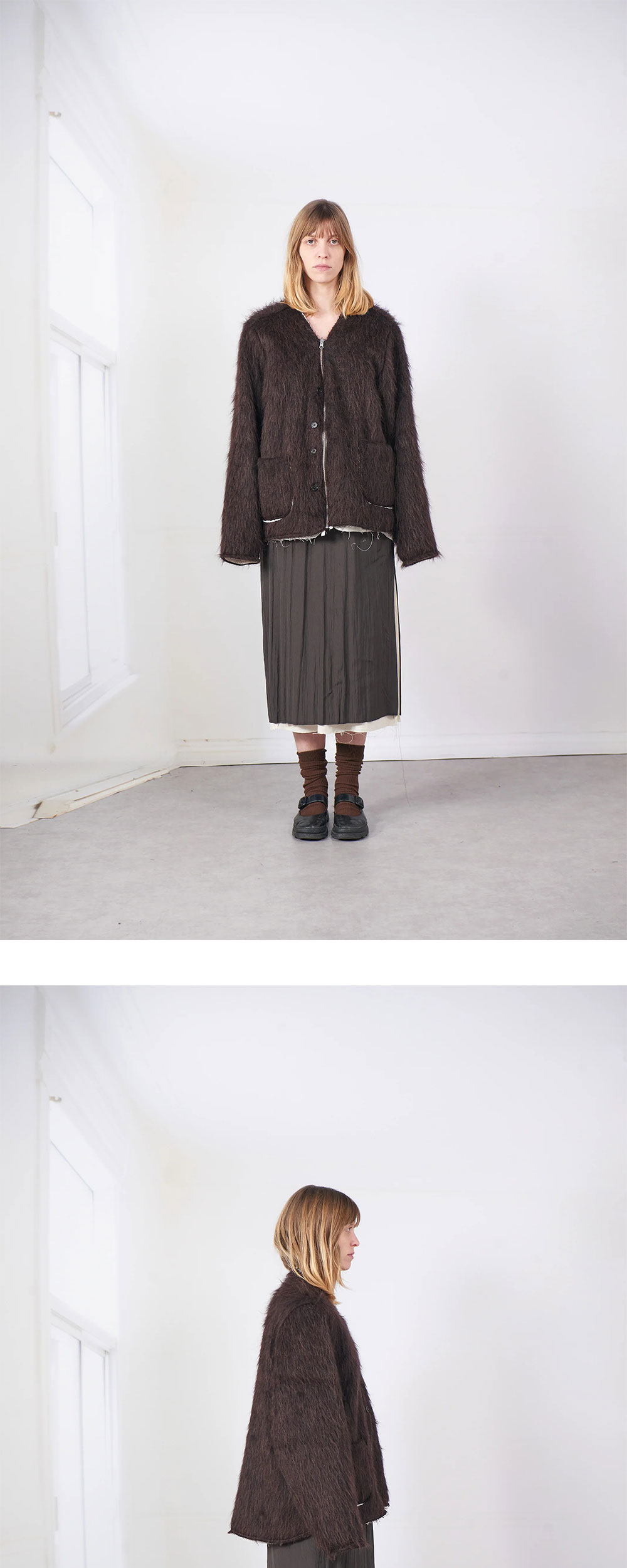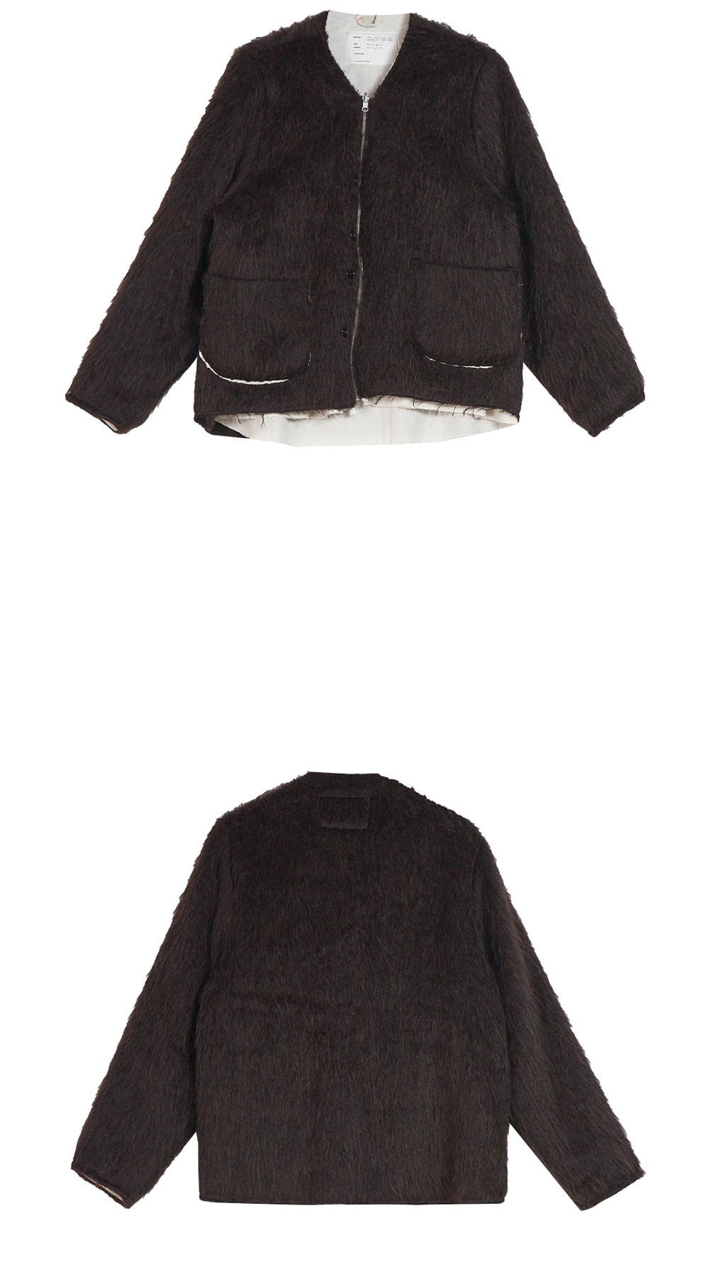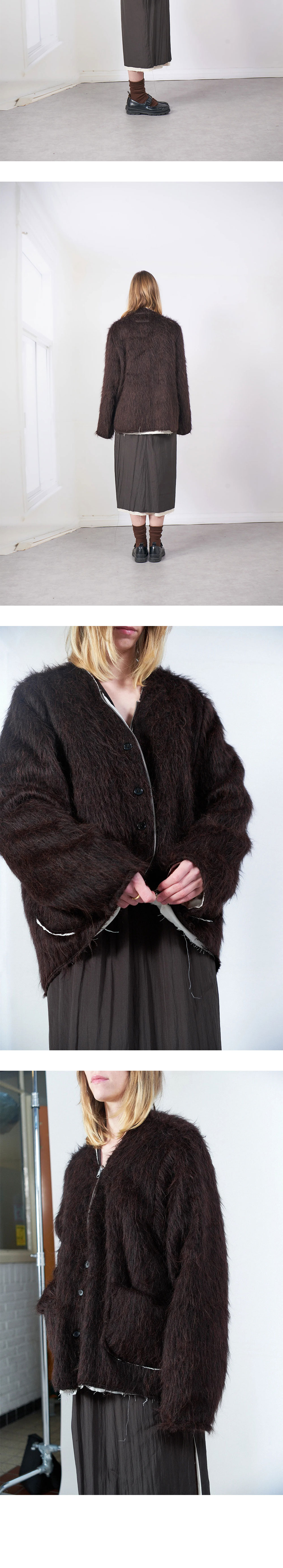 카미엘 포트젠스 카디 비 브라운입니다. - 브이넥 울믹스 퍼 가디건 - 지퍼 및 버튼 클로저 - 로우 디테일 - 밑단 흰 안감 노출 - 패치 포켓