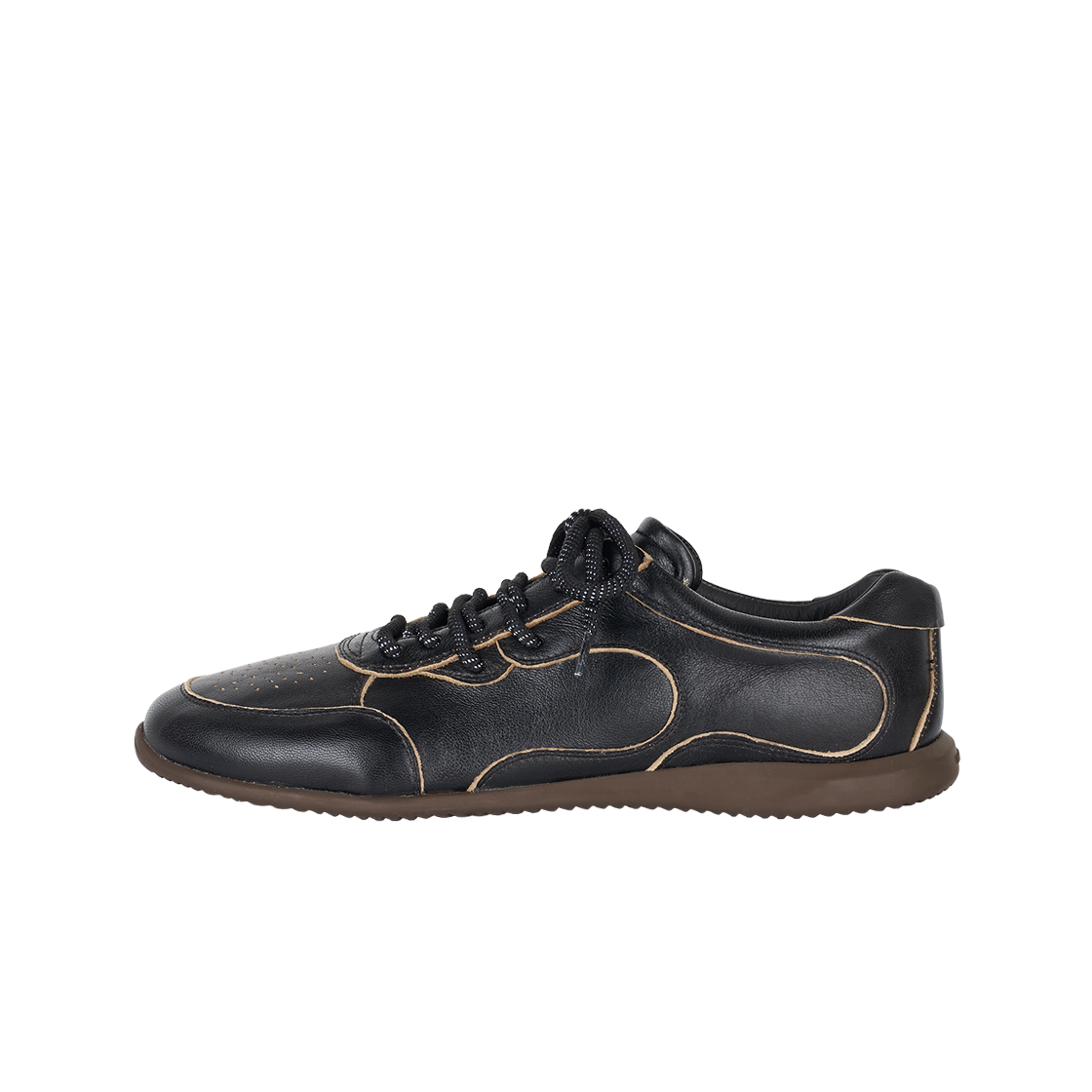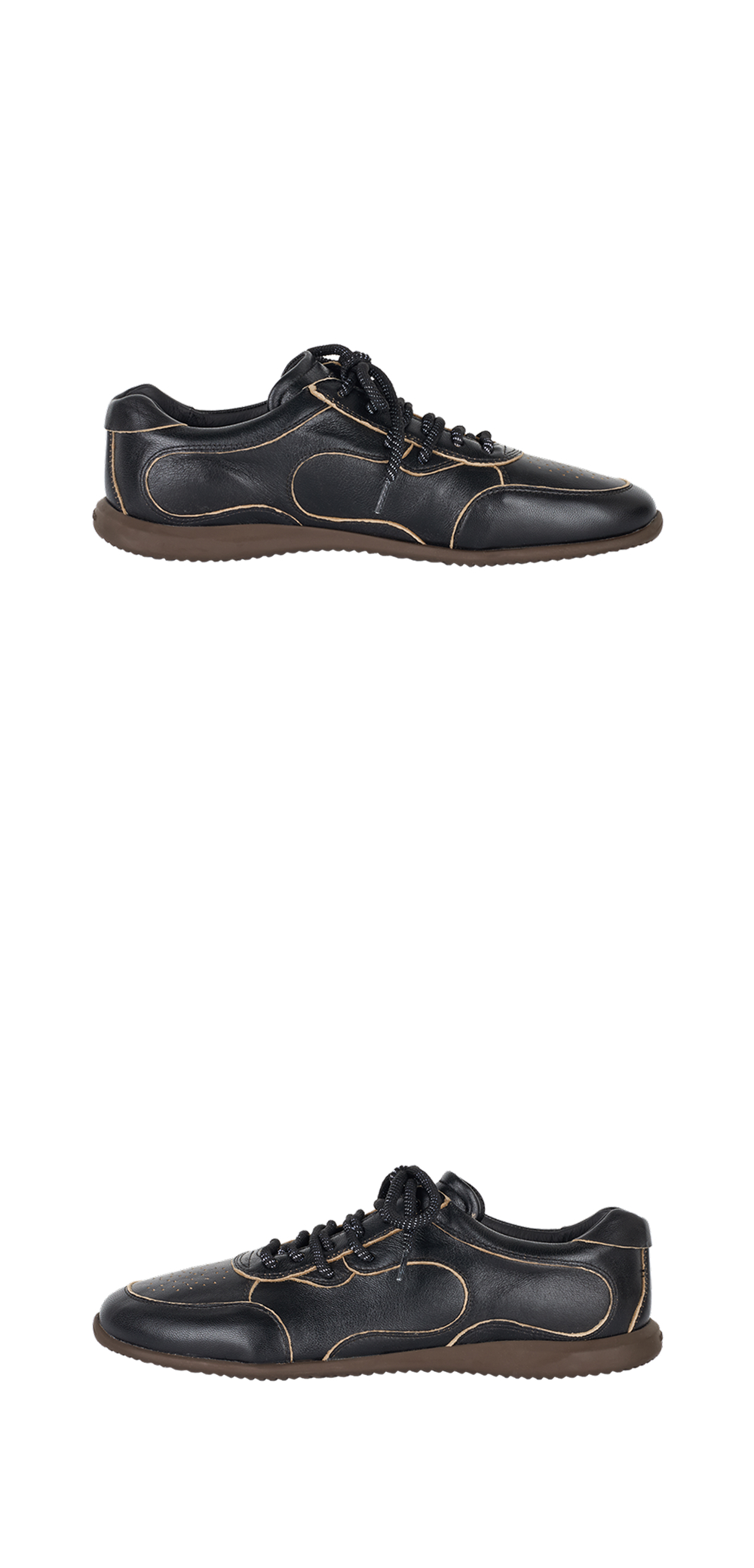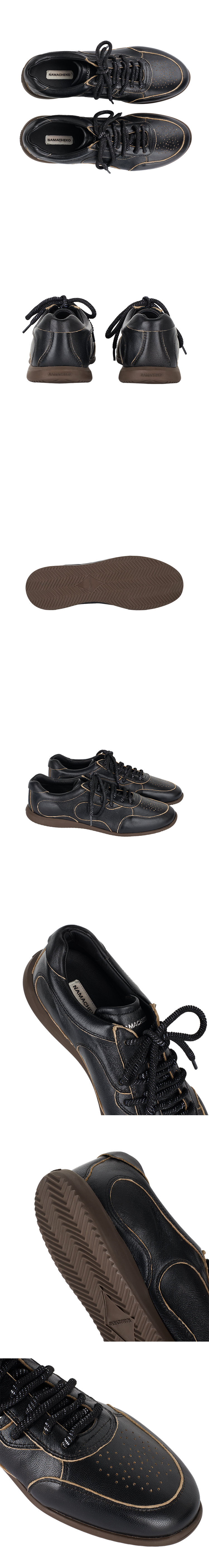 나마체코 오스터리 스니커 블랙 아스포르타빌레입니다. - 블랙 가죽 어퍼 - 테두리를 따라 노출된 베이지색 안감 - 토캡 부분의 작은 타공 디테일 - 곡선형의 유기적인 패널 디자인 - 뒤꿈치 부분에 새겨진 로고 - 브라운컬러의 플랫한 밑창