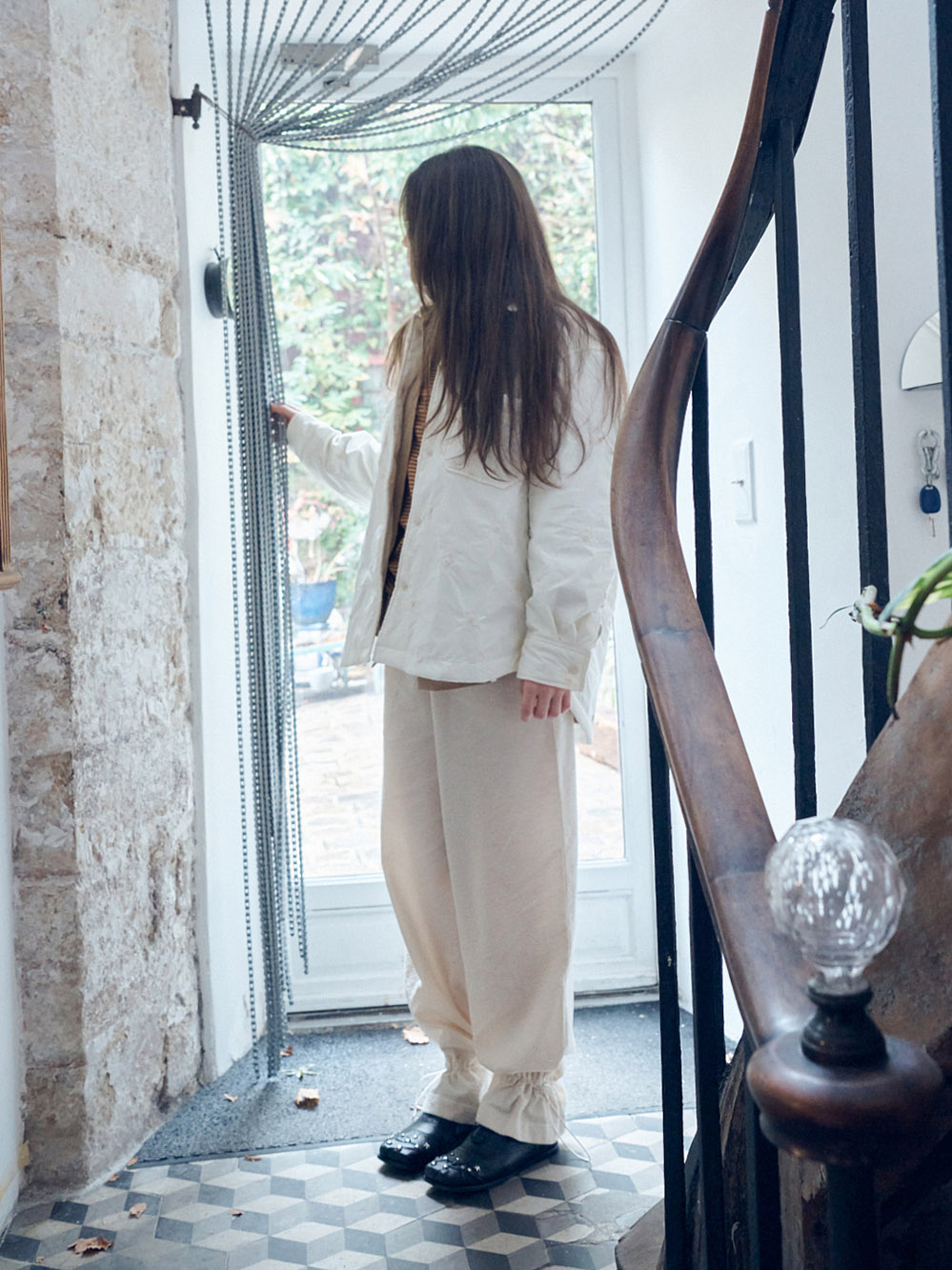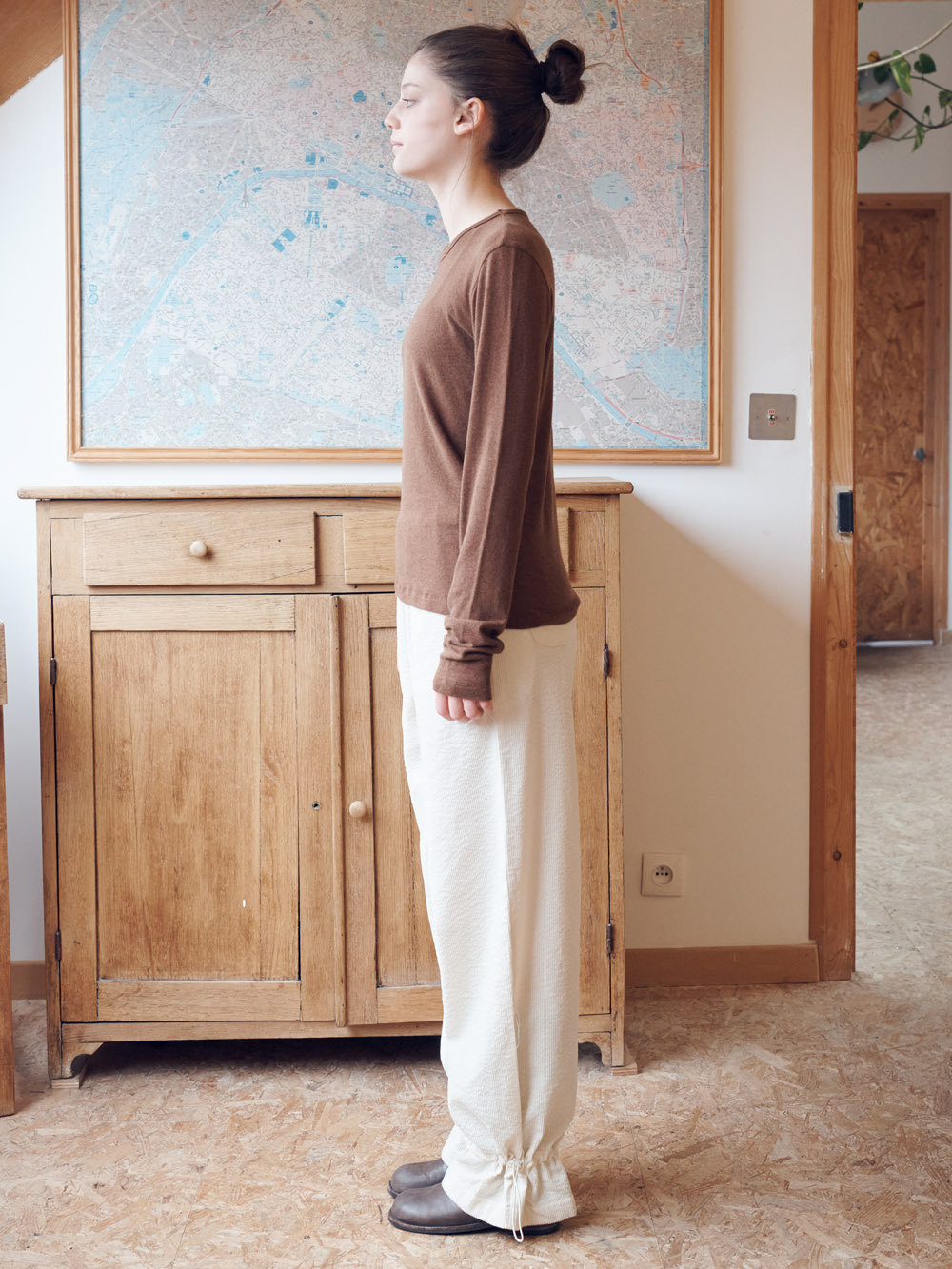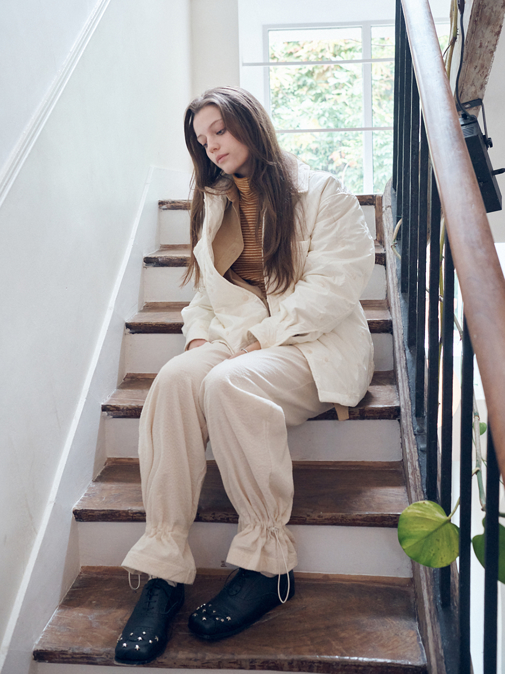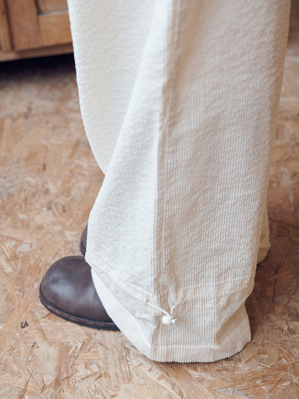 2025 FW COLLECTION - 여유로운 실루엣의 밴딩 팬츠 - 독특한 변형 코듀로이 조직 - 워싱처리의 후가공 처리가 되어있는 부드럽고 탄탄한 소재감 - 하단부의 스트랩+스토퍼를 통한 자유로운 실루엣 조절 - 측,후방 주머니 - 허리의 스트링으로 자유로운 사이즈 조절 - 제품 컬러는 상세페이지의 누끼이미지와 가장 유사합니다. - Made in korea +COLOR Cream, Brown +CARE Dry cleaning , 단독세탁 권장