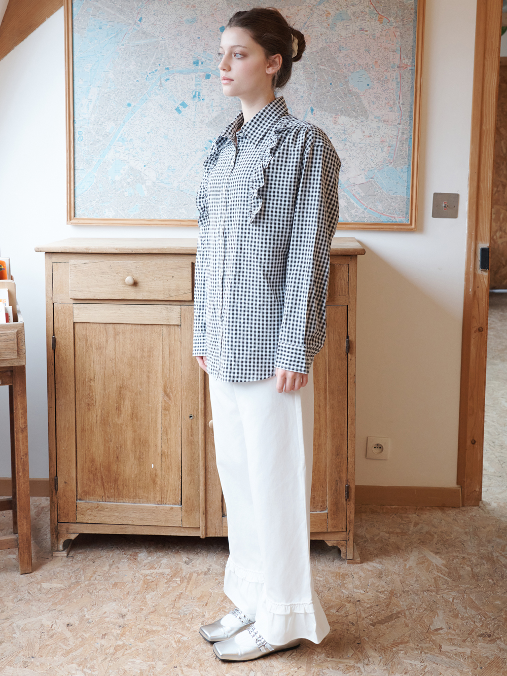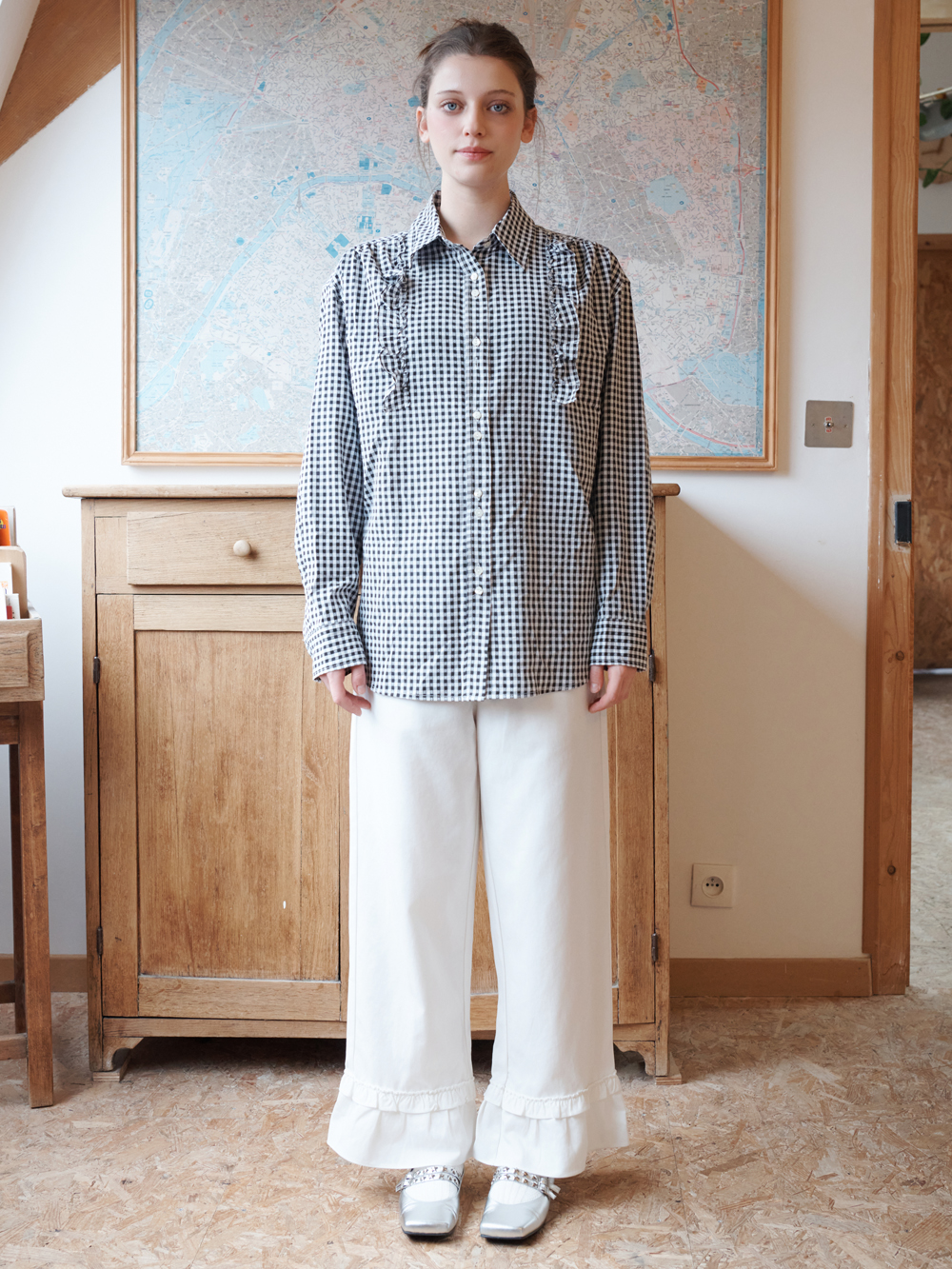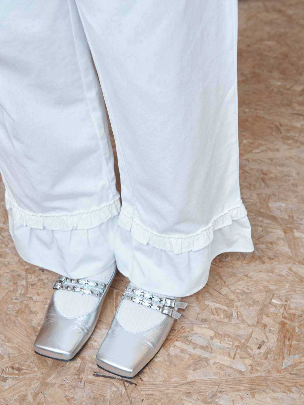2025 FW COLLECTION - 넉넉한 실루엣의 밴딩 팬츠 - cotton, tencel 혼방의 부드러운 터치감 - 셔링, 프릴 포인트 되어진 팬츠 - 측면의 주머니 - 허리의 스트링으로 자유로운 사이즈 조절 - 제품 컬러는 상세페이지의 누끼이미지와 가장 유사합니다. - Made in korea +COLOR White, Black +CARE Dry cleaning , 단독세탁 권장