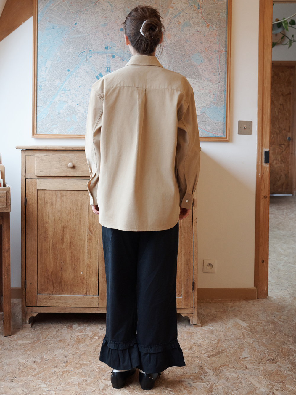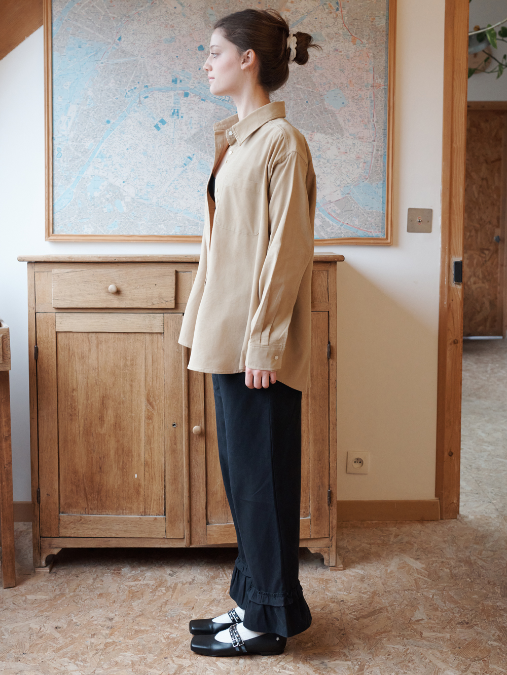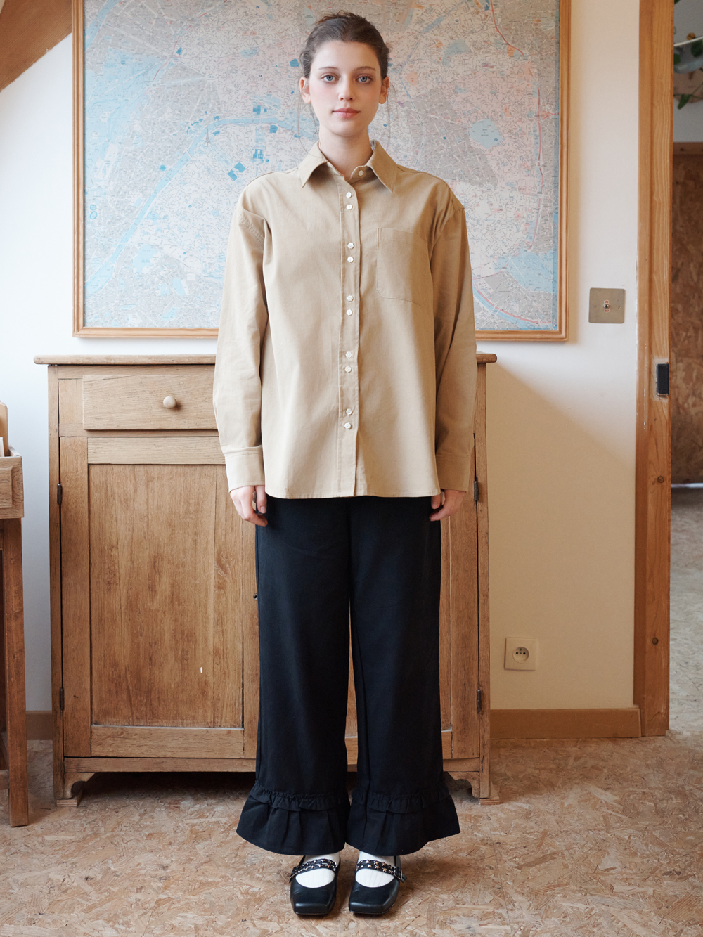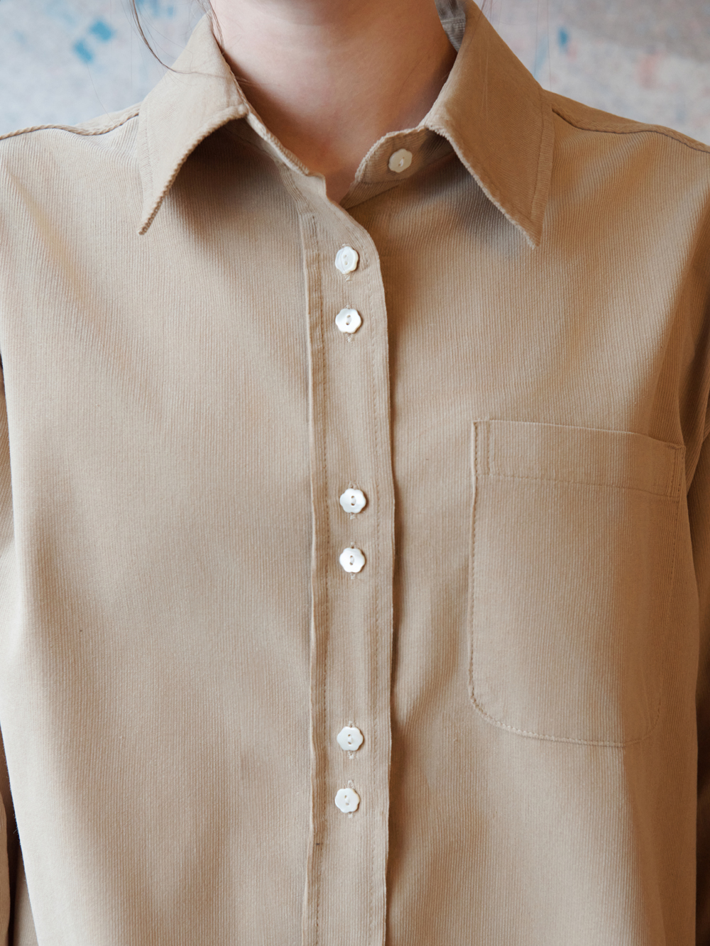 2025 FW COLLECTION - 잔잔한 조직감의 코듀로이 셔츠 - 전면, 소매부의 꽃 모양의 포인트 자개단추 - 루즈한 실루엣 - 이너 혹은 아우터로 다양하게 활용 가능한 셔츠 - 제품 컬러는 상세페이지의 누끼이미지와 가장 유사합니다. - Made in korea +COLOR Off White, Navy, Beige +CARE Dry cleaning , 단독세탁 권장