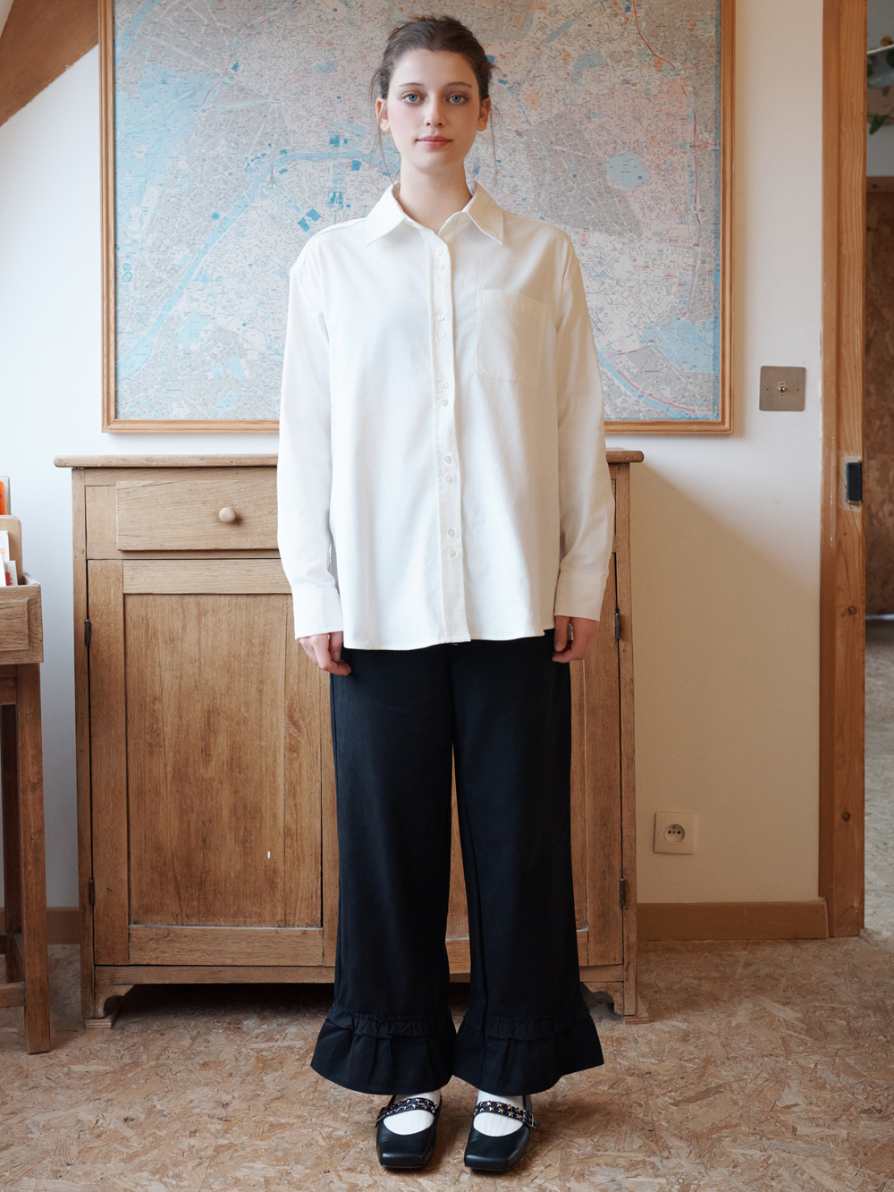 2025 FW COLLECTION - 잔잔한 조직감의 코듀로이 셔츠 - 전면, 소매부의 꽃 모양의 포인트 자개단추 - 루즈한 실루엣 - 이너 혹은 아우터로 다양하게 활용 가능한 셔츠 - 제품 컬러는 상세페이지의 누끼이미지와 가장 유사합니다. - Made in korea +COLOR Off White, Navy, Beige +CARE Dry cleaning , 단독세탁 권장