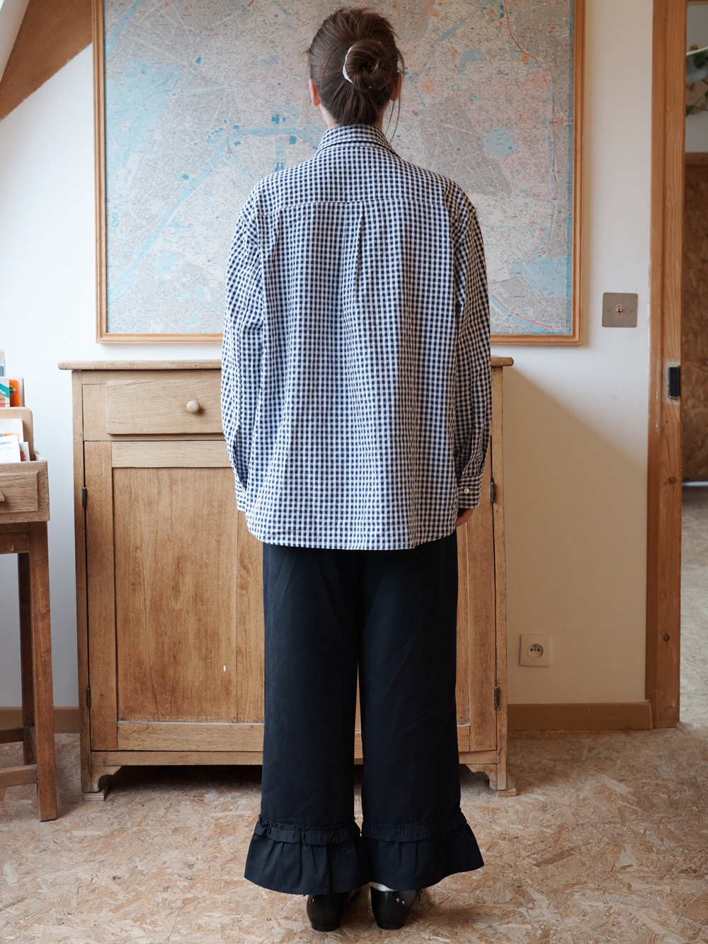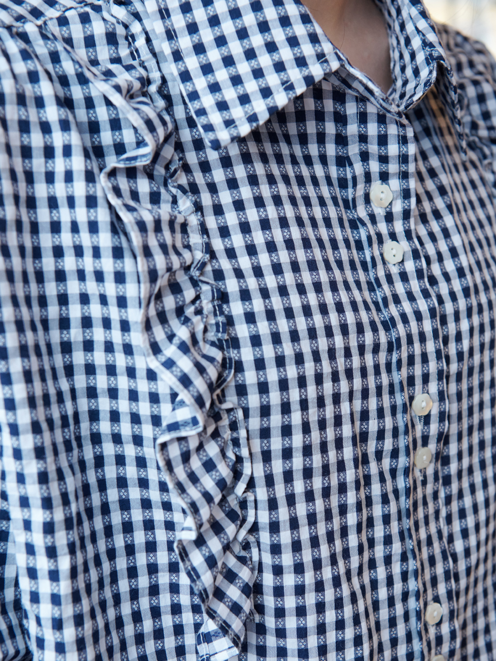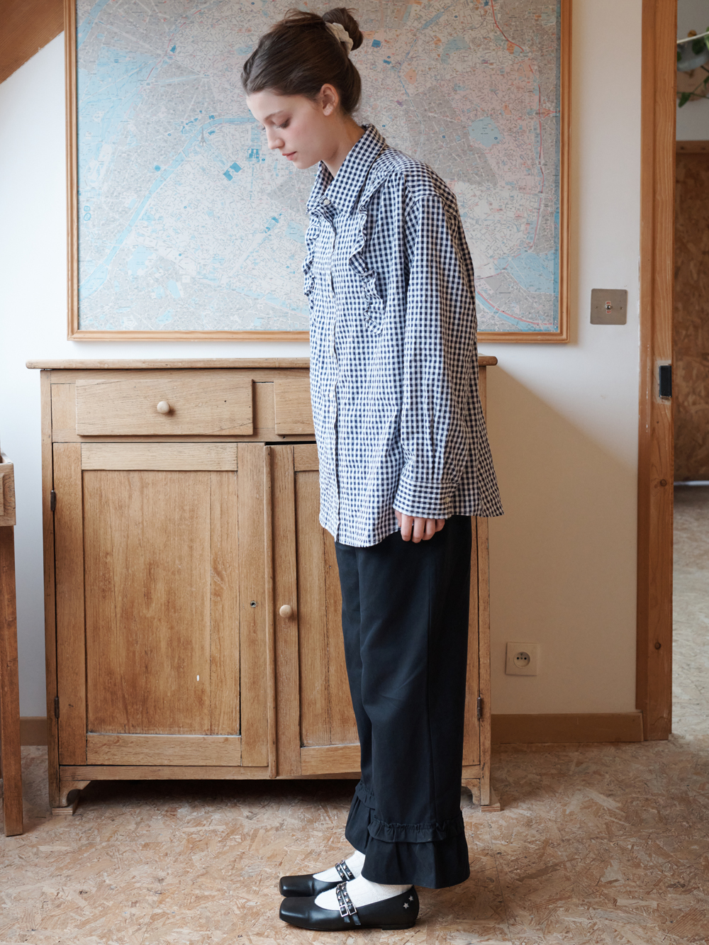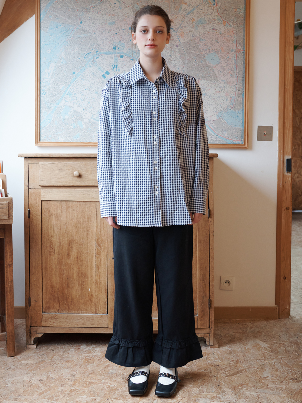 2025 FW COLLECTION - 전면의 프릴 장식이 있는 깅엄체크 셔츠 - 전면, 소매의 꽃 모양의 포인트 자개단추 - 루즈한 실루엣 - 어깨부분의 셔링 디테일 - 제품 컬러는 상세페이지의 누끼이미지와 가장 유사합니다. - Made in korea +COLOR Navy Check, Black Check +CARE Dry cleaning , 단독세탁 권장
