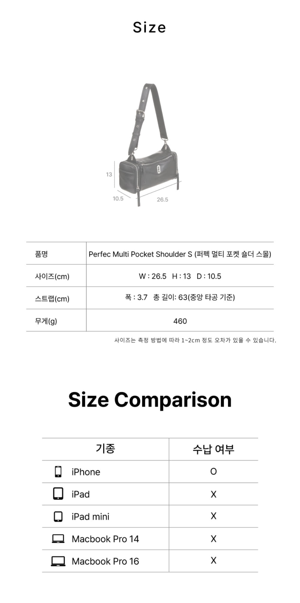 "퍼펙 멀티 포켓 숄더M의 SMALL VER."스퀘어 형태에 다양한 포켓이 있어 분리수납이 용이한 BAG.오픈 뒷포켓이 추가 되어 카드지갑이나 휴대폰 등간단한 수납이 가능한 제품.탈부착이 가능한 스트랩이 구성되어 다른 스타일의 스트랩으로 호환이 가능함.