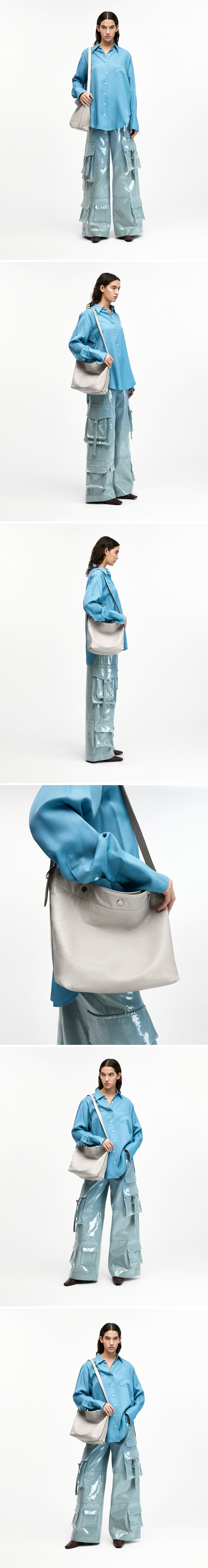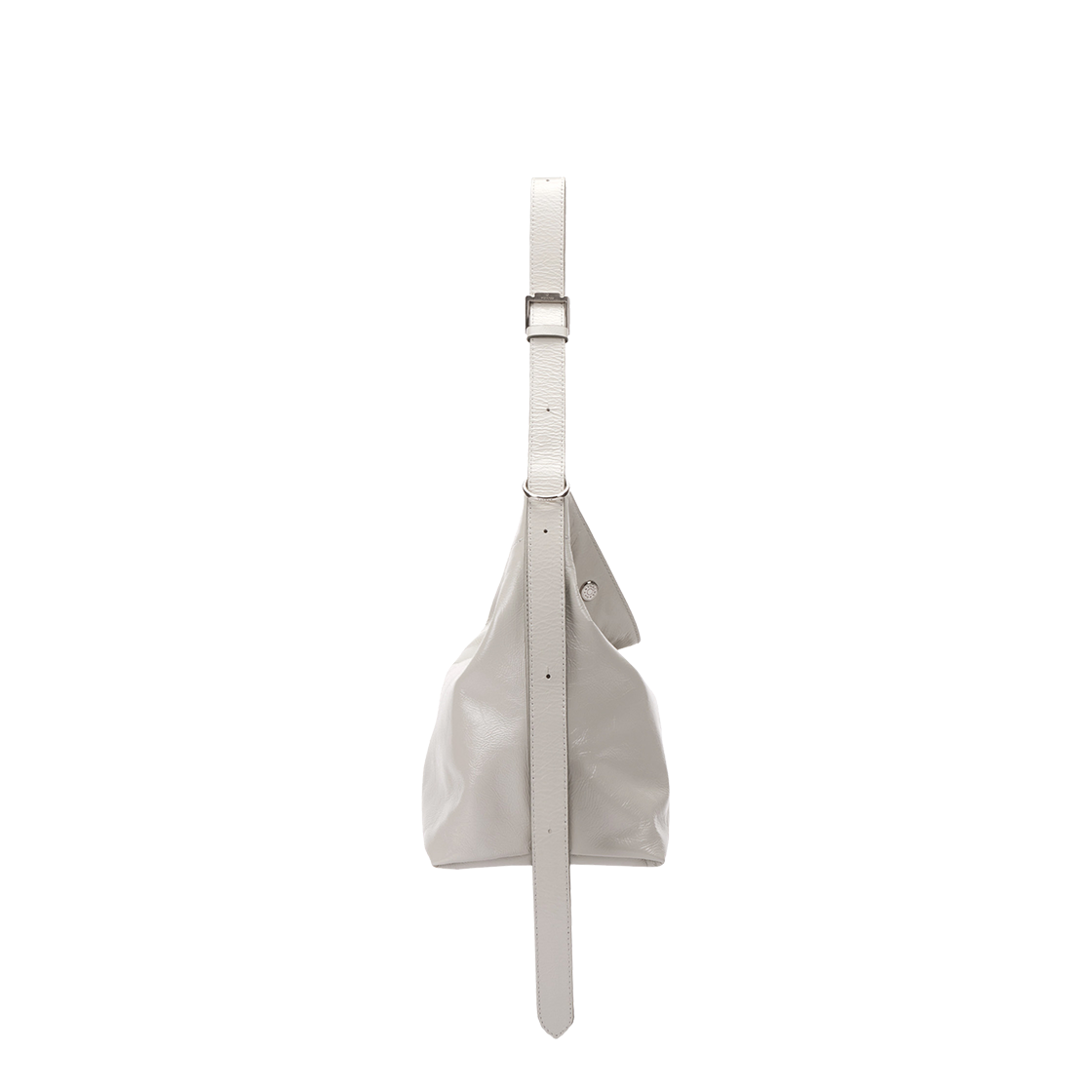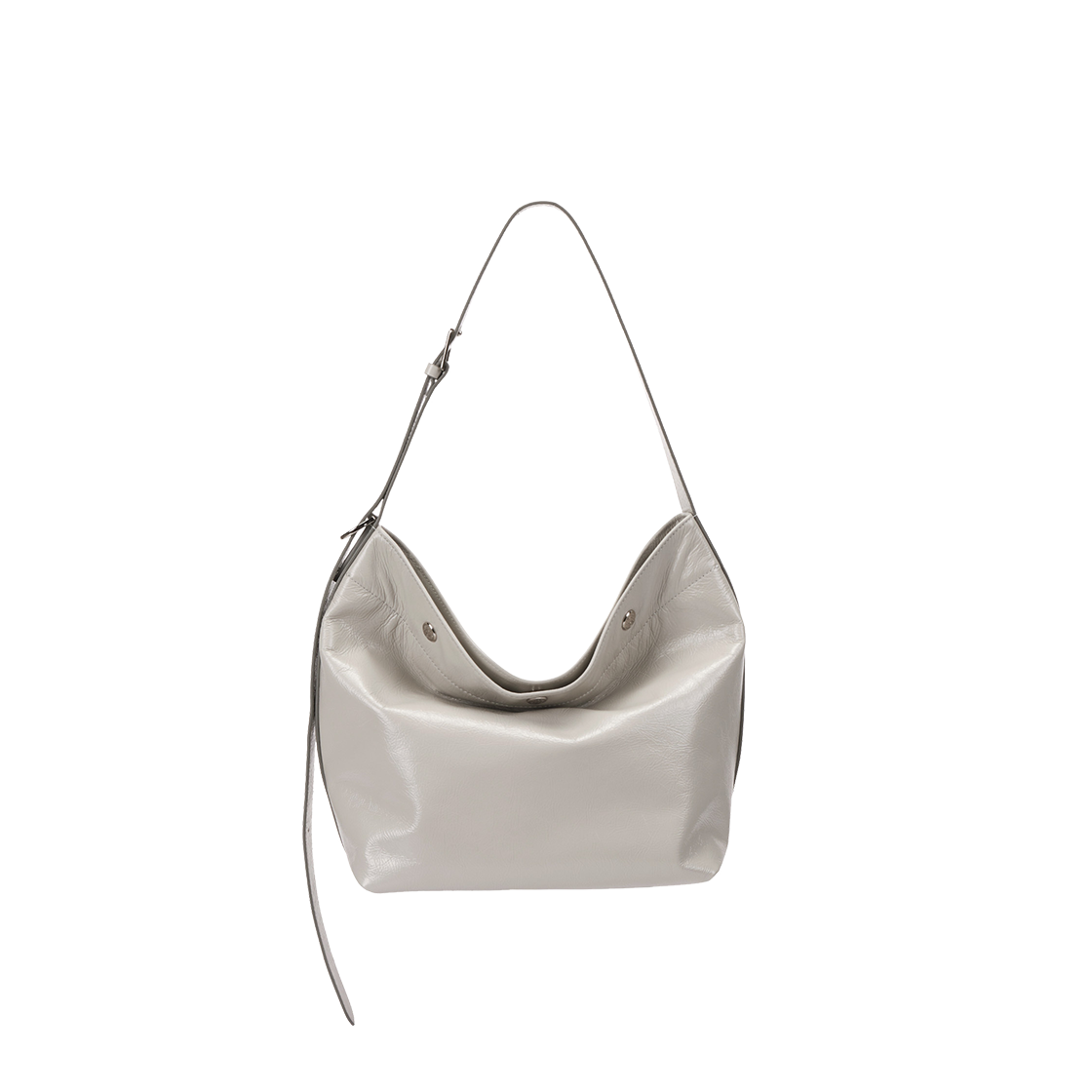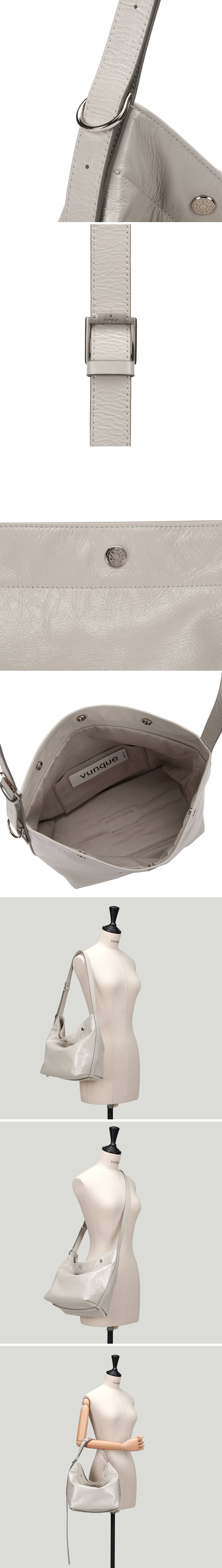 "퍼펙 버튼 업 소프트 호보L의 SMALL VER."소프트한 천연 소가죽을 사용하여 자연스럽게 쳐지는 쉐입이 특징입구 부분은 3개의 스냅장식을 사용하여 단계별 클로징이 가능하며,길이 조절이 가능한 고정형 스트랩 구성스트랩에 고정된 D링은 참 등의 장식을 걸 수 있음
