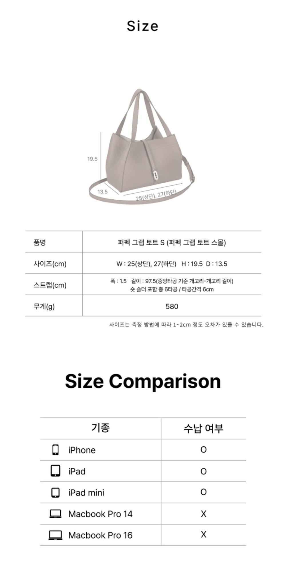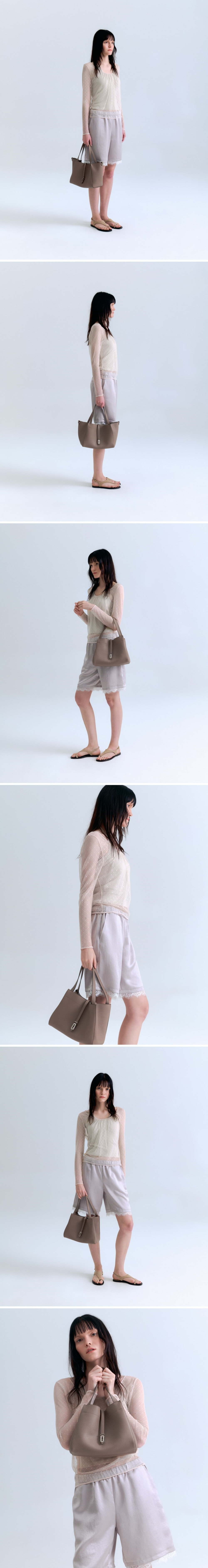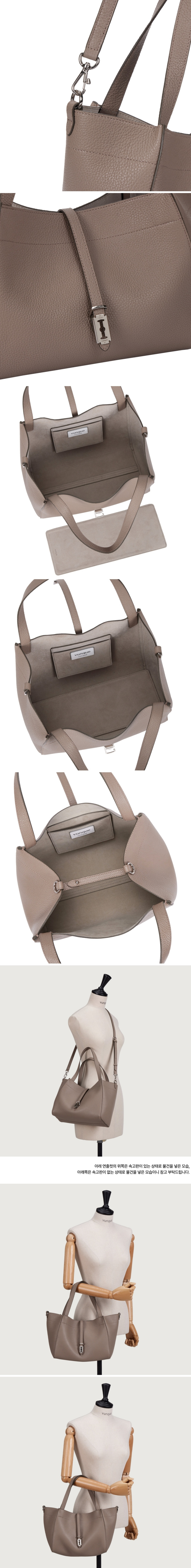 내츄럴한 가죽을 사용하여 자연스럽게 쳐짐이 특징인 토트백내부에 탈부착 가능한 속고판이 있어 물건 수납시 보완 가능양옆 개고리에 스트랩 연결하여 크로스로 착용 가능
