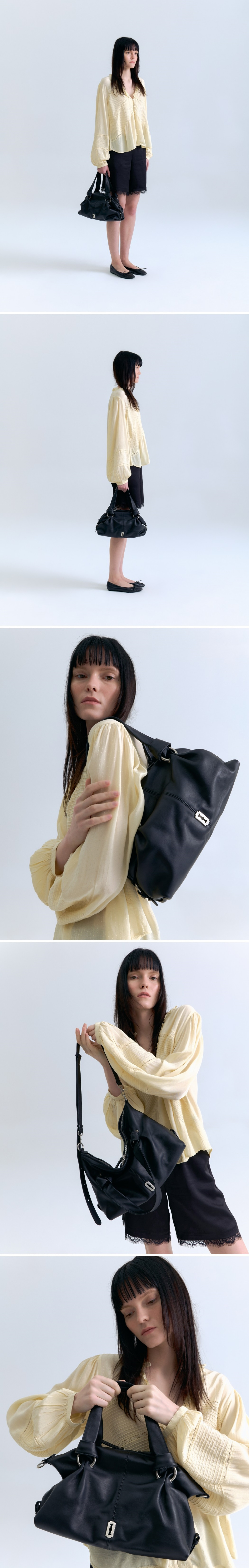 소프트한 가죽으로 자연스럽게 처지는 쉐입이 특징인 토트백볼드한 오링으로 드레이핑하여 청키하고 시크한 매력이 특징양쪽 고리를 조절하여 다양한 쉐입으로 연출 가능