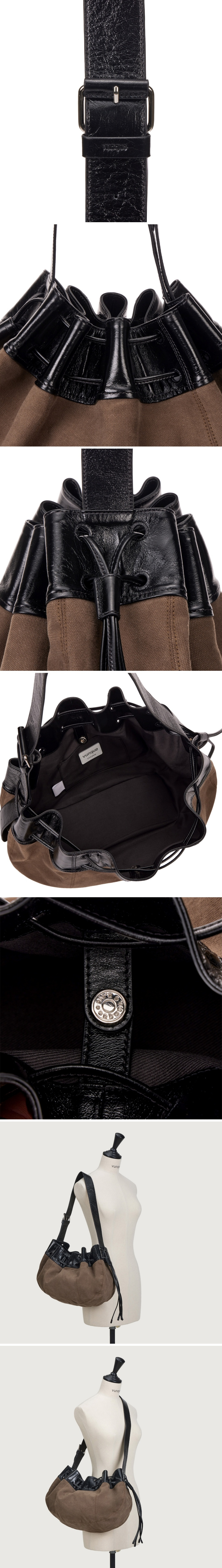 우아한 곡선 라인으로 웨이브 바디 쉐입의 호보백통수납이 가능한 디자인으로 수납력이 좋은 아이템캔버스 원단과 빈티지 레더 콤비