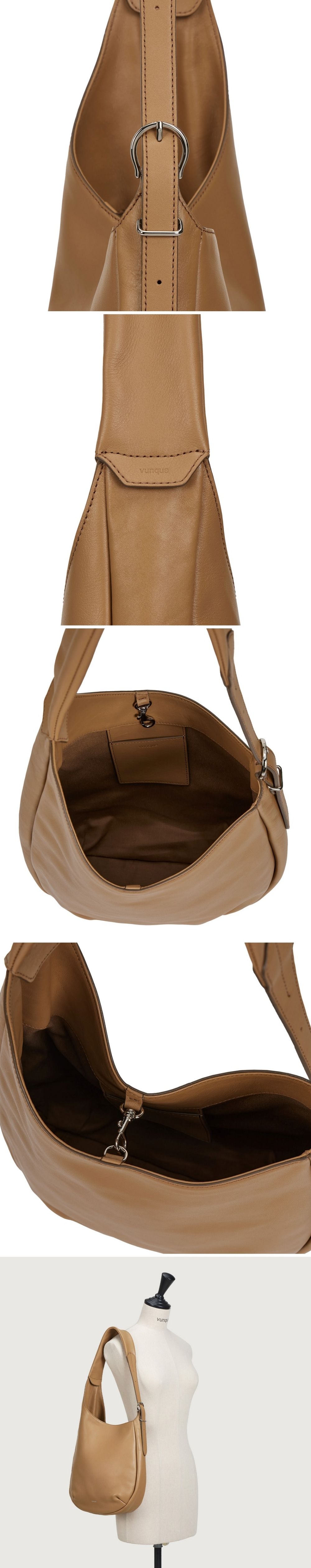 시즌 테마 'Tanz Theater' 무드를 살려서 비대칭의 우아한 곡선 실루엣을 적용한 호보백곡선이 돋보일 수 있도록 은은한 광이 나는 민자 가죽을 사용스트랩 폭이 자연스럽게 넓어지는 구조로 착용시 편안함