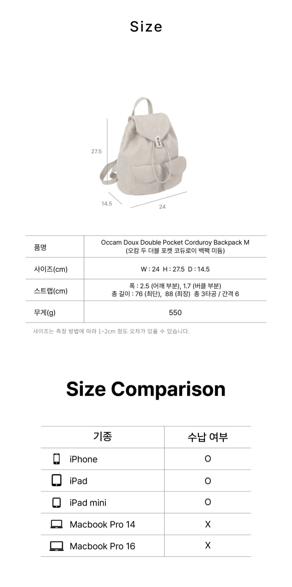 오캄 두 더블 포켓 백팩의 코듀로이 버전코듀로이 특유의 따뜻하고 부드러운 질감이 특징옆면 지퍼 등 다양한 방식의 수납 형태와 공간을 보유옆면 하단 D자 고리에 참 장식 스타일링 가능※ 소재 특성상 수분 또는 마찰에 의한 이염이 발생할 수 있으니, 착용 시 주의하여 주시기 바랍니다.