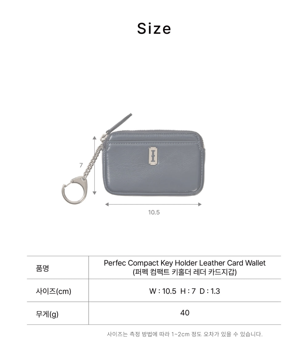 한 손에 들어오는 컴팩트한 사이즈의 지퍼 카드지갑앞/뒤 카드 포켓과 통수납 스펙으로 수납력 우수키링이 달려있어 휴대성이 용이함(내부) 지퍼 통수납칸 1 / (외부) 카드칸 2