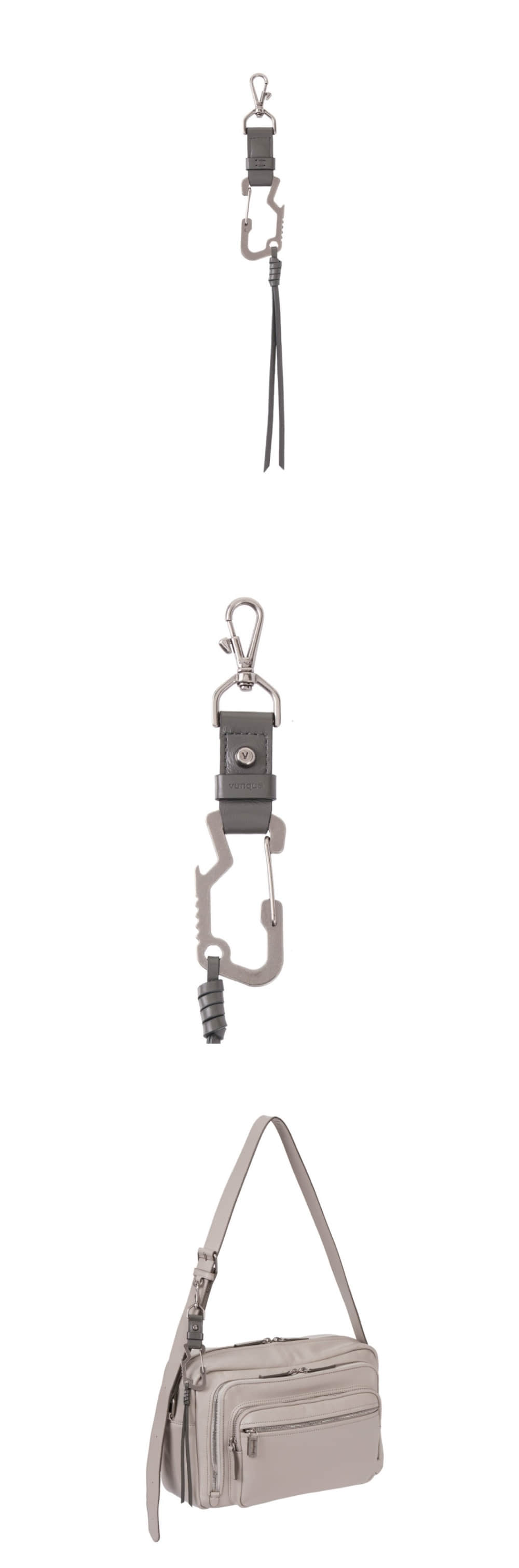 젠더리스 느낌의 꼬임 장식과 카라비너 믹스매치가 포인트인 참개고리와 카라비너가 함께 매치되어 있어 원하는 방향으로 사용 가능