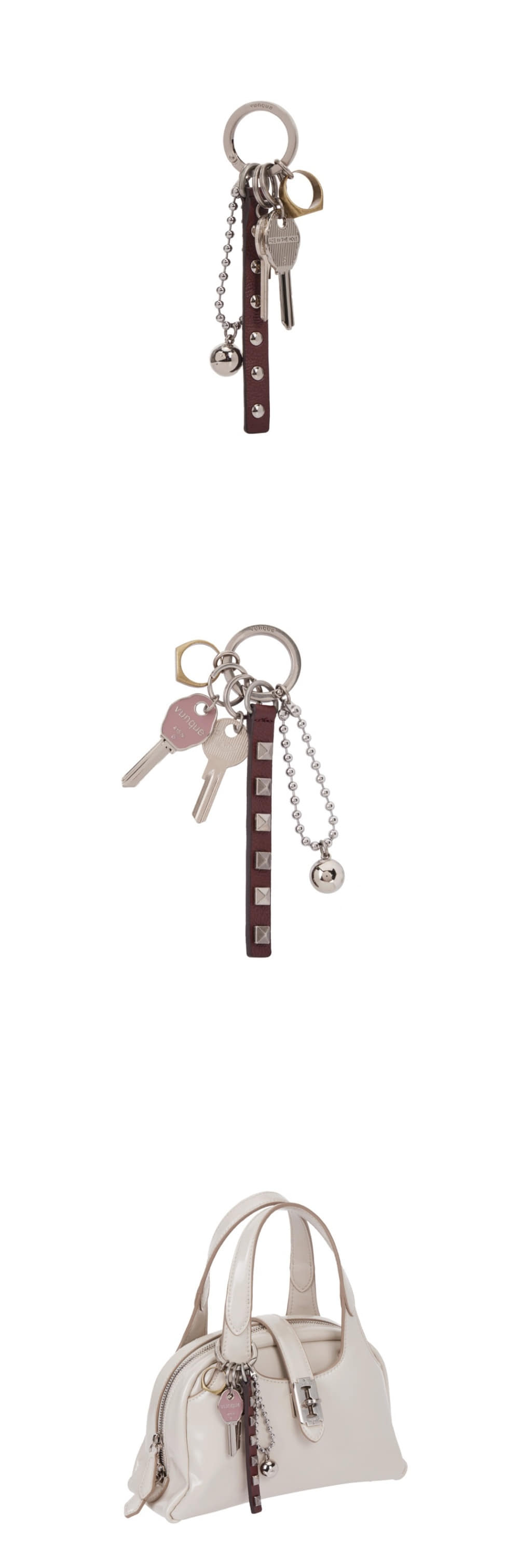 시즌성을 담은 메탈릭한 무드의 참스터드 장식이 포인트인 가죽띠와 분크의 새로운 열쇠 장식, 반지 등 다양한 오브제들을 원하는대로 믹스 매치하여 다양한 느낌으로 연출할 수 있음