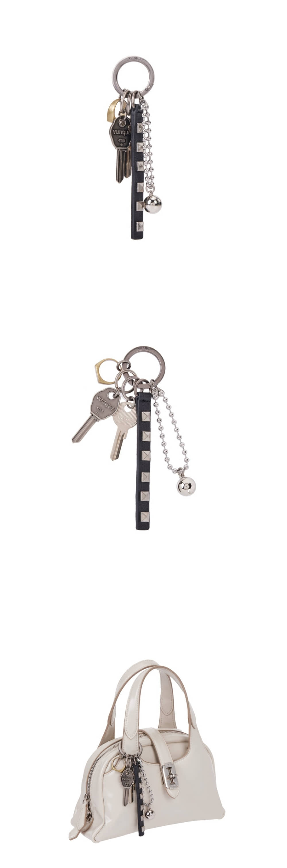 시즌성을 담은 메탈릭한 무드의 참스터드 장식이 포인트인 가죽띠와 분크의 새로운 열쇠 장식, 반지 등 다양한 오브제들을 원하는대로 믹스 매치하여 다양한 느낌으로 연출할 수 있음