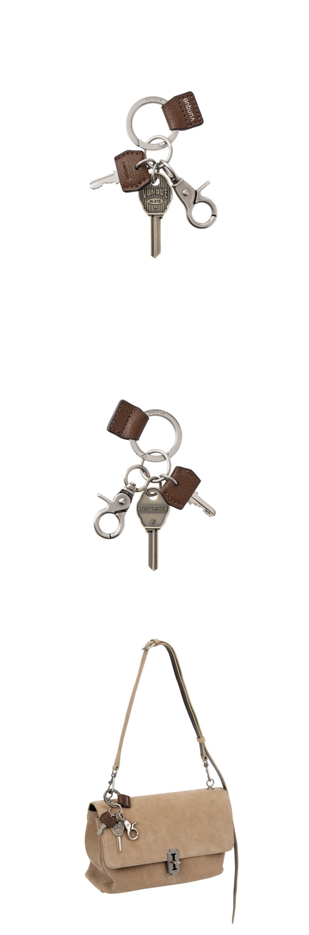 열쇠를 메인 테마로 디자인한 젠더리스 무드의 키 참엔틱한 무드의 열쇠 장식과 레더 포인트가 있어 고급스러움을 더함