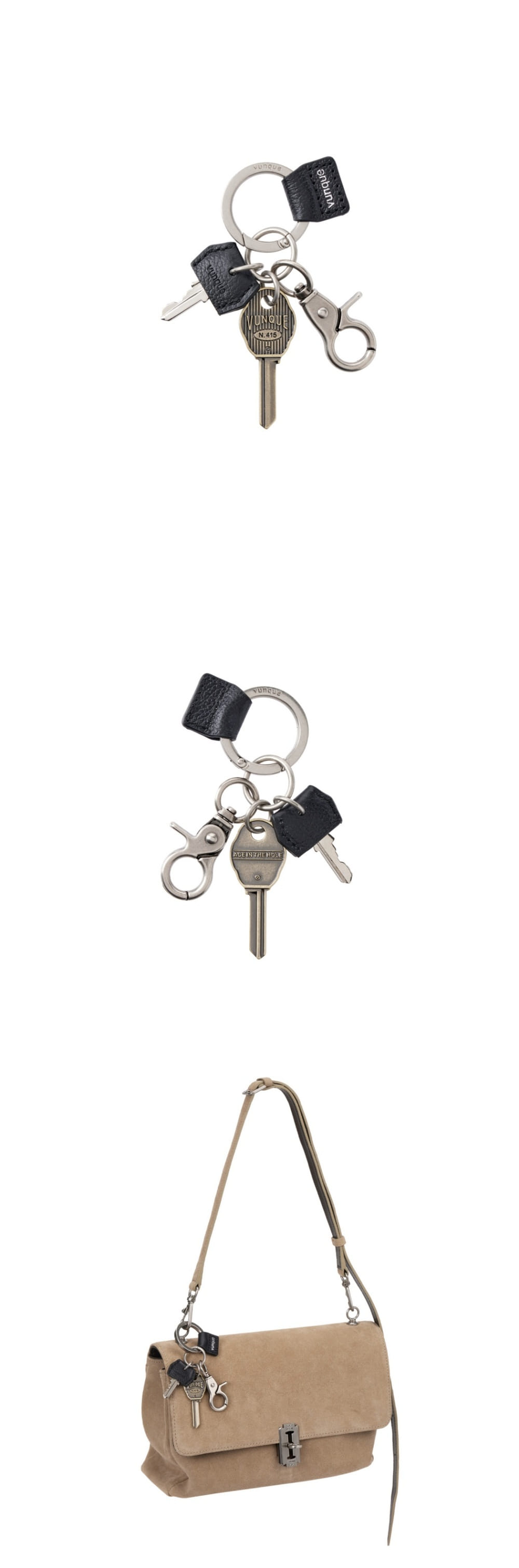 열쇠를 메인 테마로 디자인한 젠더리스 무드의 키 참엔틱한 무드의 열쇠 장식과 레더 포인트가 있어 고급스러움을 더함
