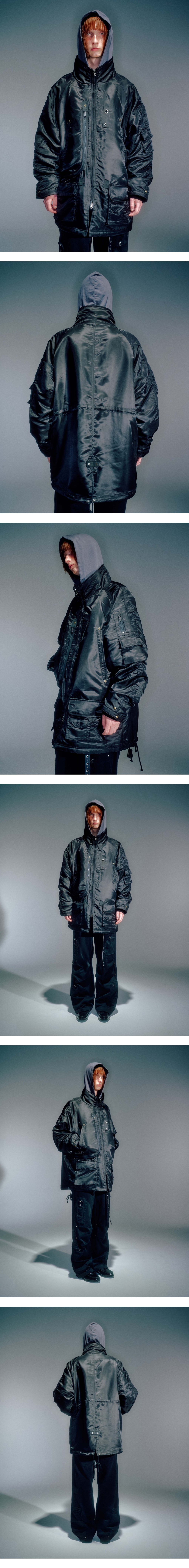 전면부 입체 포켓 디테일 소매 더블 포켓 디테일로 수납공간 확보 밀리터리 웨빙 디테일 베이컨트 제작 리벳 사용 빈티지한 올풀림 연출 YKK 2WAY 지퍼 사용 내부 충전재 사용 S / M / L (CM) Length : 87 / 89 / 91 Bust : 69 / 71 / 73 Sleeve : 86 / 91 / 93 Model is 182cm and is wearing a size L SHELL : POLYESTER 100% LINING 1 : POLYESTER 100% LINING 2 : POLYESTER 100% 1. 단독 드라이클리닝 하십시오. 2. 장식 및 고무제 라벨 다림질을 금지합니다. 3. 기계 건조 사용을 금지합니다. 4. 탈착이 불가능한 장식물은 은박지로 싼 후 클리닝 하십시오. 5. 올 뜯김 및 필링에 주의하십시오. 6. 이염 및 변색을 주의하십시오. 7. 가열 제품의 사용을 절대 금합니다. 8. 난방 기구 등 열기 가까이 두지 마십시오. 9. 자수 및 프린트 부분에 마찰이 생기지 않도록 주의하세요.