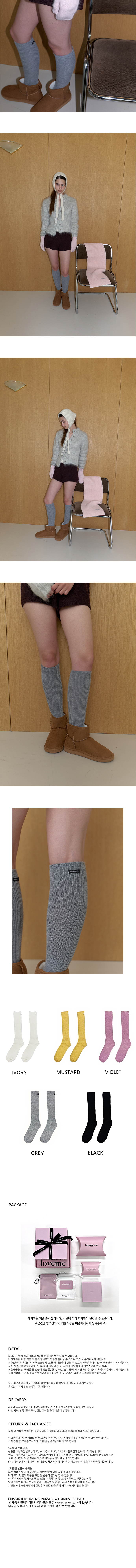 베이직한 골지 니트 울 양말입니다. 메리노울 혼방 소재로 보온성이 탁월하며 벌키한 느낌의 두툼한 골지 조직이 특징입니다. 무릎 아래로 올라오는 니삭스로 다양한 스타일에 포인트가 되어줍니다. 양말 윗부분에 'lovememonster' 로고라벨을 달아 마무리 했습니다. 컬러는 화이트, 머스타드, 바이올렛, 그레이, 블랙 총 5가지가 있습니다. *시착의 흔적이 남는 제품 특성상 시착후 단순 변심으로 인한 교환 및 환불이 불가합니다. 이미 착용했거나 라벨이 제거된 양말은 수령하지 않으며 재판매가 가능한 상태에서만 교환 및 반품 진행이 가능합니다. 다음의 경우에는 무상으로 교환 및 환불 처리가 가능합니다. 1) 수령하신 제품에 시착 전 불량이 있는 경우, 2) 주문하신 상품과 다른 제품을 받은 경우
