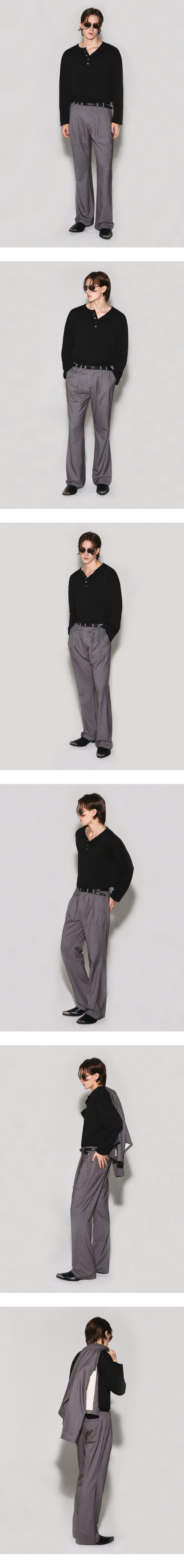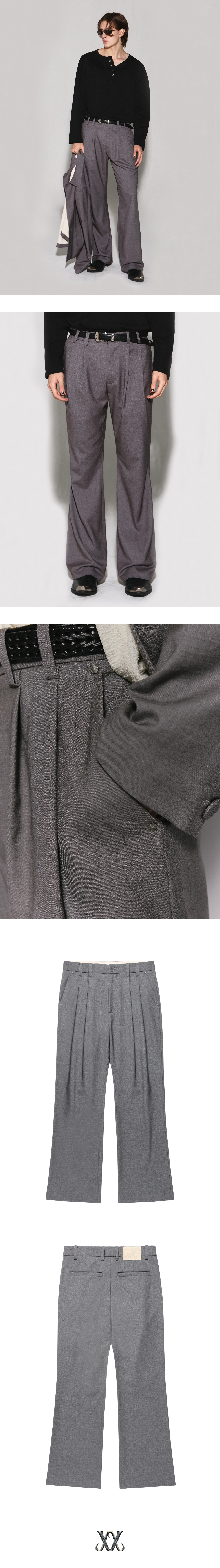 - 여유로운 핏의 플레어 라인 슬랙스 - 정면 두개의 턱과 턱 상단 벨트고리 디테일 - 싸개단추 중앙 여밈과 포켓 입구 금속 리벳 포인트 - 뒷면 웨슬리 휴스턴 스웨이드 로고 텍션지 - 내부 아이보리 코튼 안감 마감 - DRY CLEAN ONLY