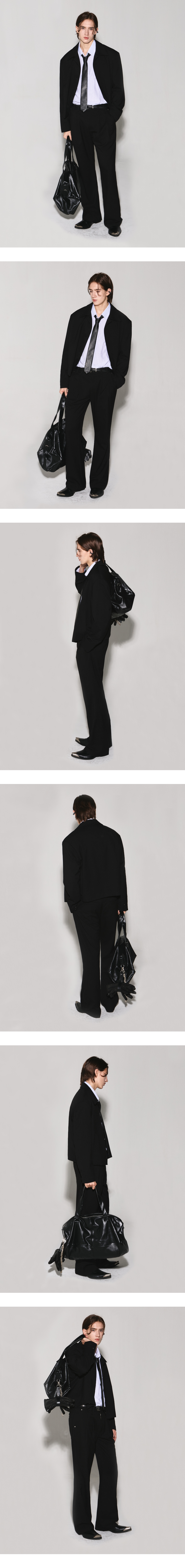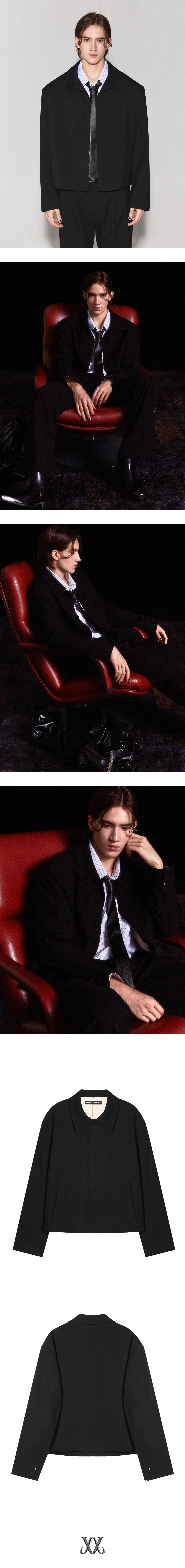 - 크롭한 기장감의 세미 오버핏 실루엣 울 자켓 - 중앙부터 밑단까지 이어지는 독특한 포켓 디자인 - 원단을 감싸서 만든 싸개단추 여밈과 소매 트임 - 어깨 실루엣을 살려주는 패드, 암홀 부자재 사용 - 내부 아이보리 코튼 안감과 로고 각인 리벳 마감 - DRY CLEAN ONLY