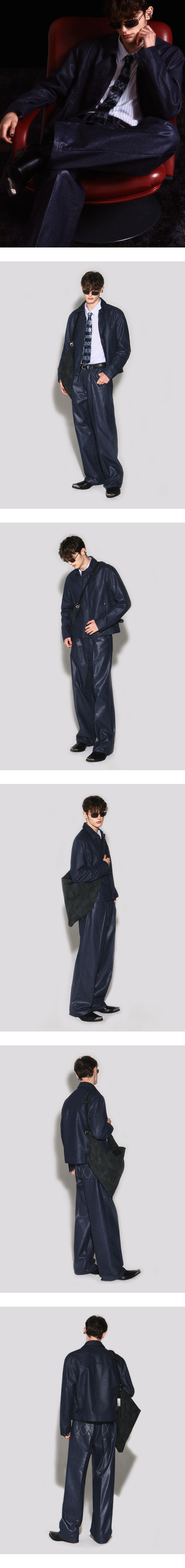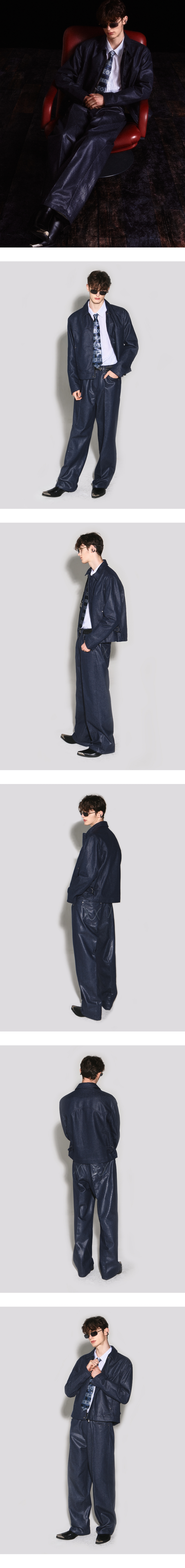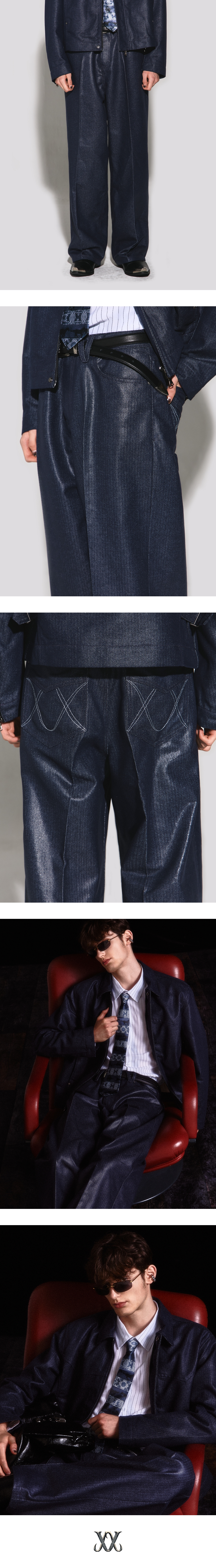 - 헤링본 패턴이 매력적인 코팅 데님 와이드 핏 데님팬츠 - 정면 V 모양 벨트고리, 후면 웨스턴 요크 라인 디테일 - 뒤포켓 로고 모양 스티치와 장식 절개 포인트 - 흑니켈 로고 각인 금속 캔톤, 리벳 부자재 사용 - 웨슬리 휴스턴 로고 스웨이드 텍션지 마감 - DRY CLEAN ONLY