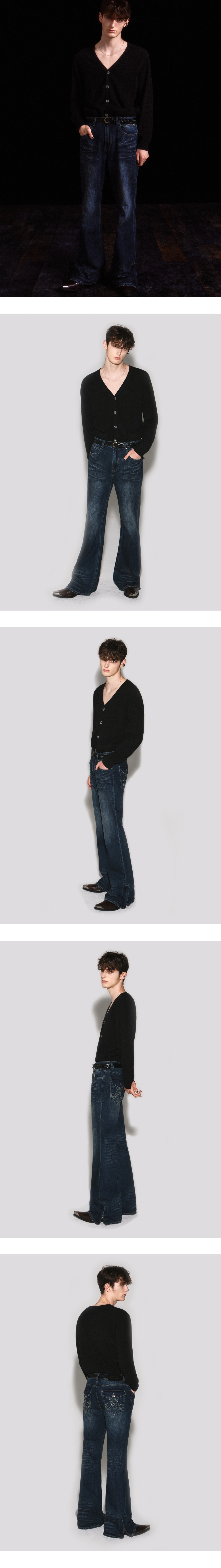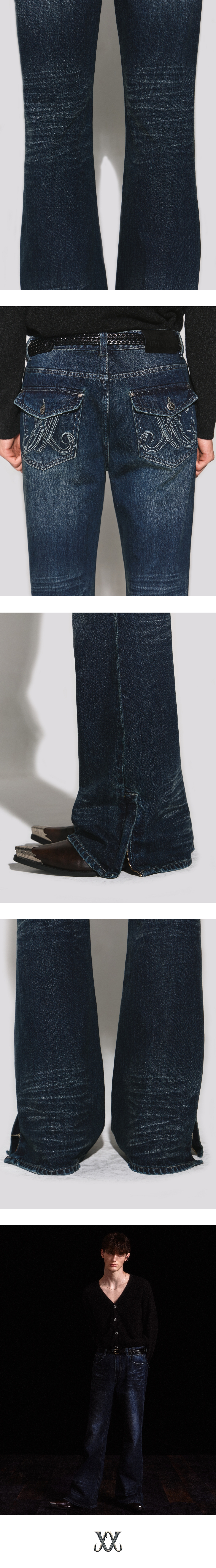 - 부츠컷 실루엣과 딥 블루 컬러감의 데님 팬츠 - 허벅지의 은은한 브러쉬와 오금, 밑단의 캣 워싱 - 앞 & 뒤 포켓과 밑단의 기스 구제 워싱 디테일 - 뒤포켓 고급스러운 로고 자수 스티치 포인트 - 밑단 YKK 지퍼로 다양한 부츠컷 실루엣 연출 - 흑니켈 로고 각인 금속 캔톤, 리벳 사용 - 웨슬리 휴스턴 로고 스웨이드 텍션지 마감 - DRY CLEAN or WASH SEPARATELY
