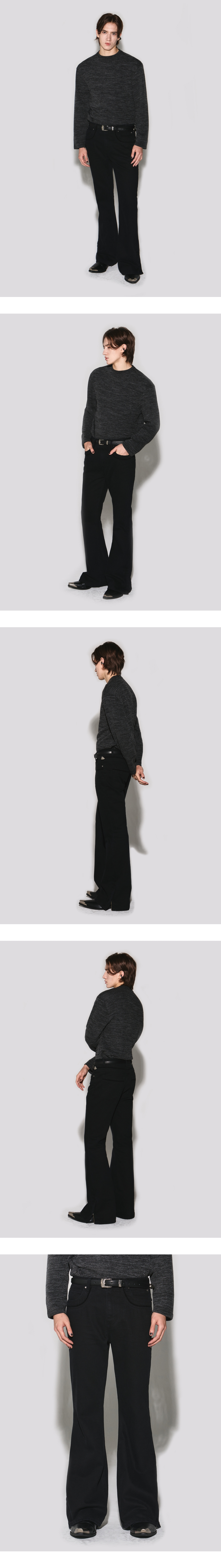 - 부츠컷 실루엣과 딥 한 컬러감의 블랙 데님 팬츠 - 앞 & 뒤 포켓, 뒷 요크의 절개 디테일 - 웨스턴 문양의 블랙 벨벳 테이프 포인트 - 허벅지, 오금, 밑단 엠보 캣 워싱 작업 - 밑단 YKK 지퍼로 다양한 부츠컷 실루엣 연출 - 흑니켈 금속 캔톤과 리벳, 기모 주머니감 사용 - 웨슬리 휴스턴 로고 각인 스웨이드 텍션지 마감 - DRY CLEAN or WASH SEPARATELY