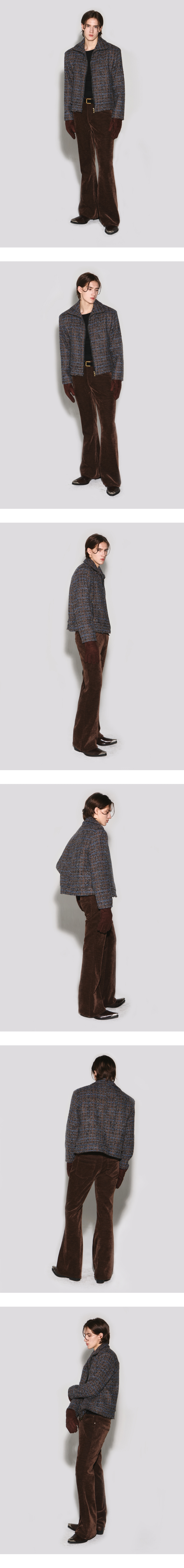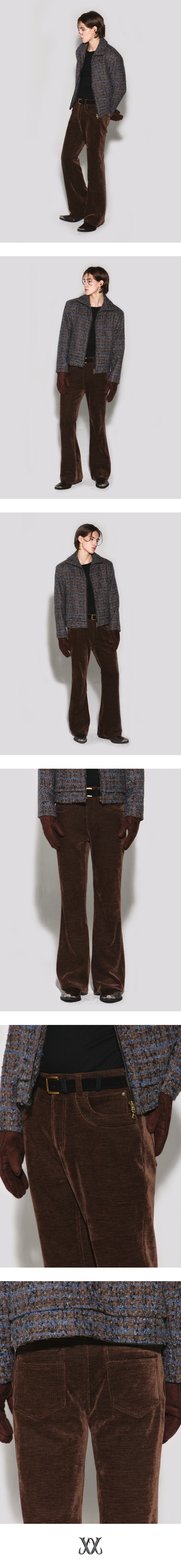 - 부드러운 터치감의 벨벳 코듀로이 부츠컷 팬츠 - 앞 & 뒤 포켓, 뒷 요크의 절개 디테일 - 웨스턴 문양의 브라운 벨벳 테이프 포인트 - 뒤 중심 허릿단 V 모양 벨트고리 디테일 - 뒤 포켓 하단 웨스턴 곡선 라인 디자인 - 흑니켈 금속 캔톤과 리벳, 기모 주머니감 사용 - 웨슬리 휴스턴 로고 각인 스웨이드 텍션지 마감 - DRY CLEAN or WASH SEPARATELY