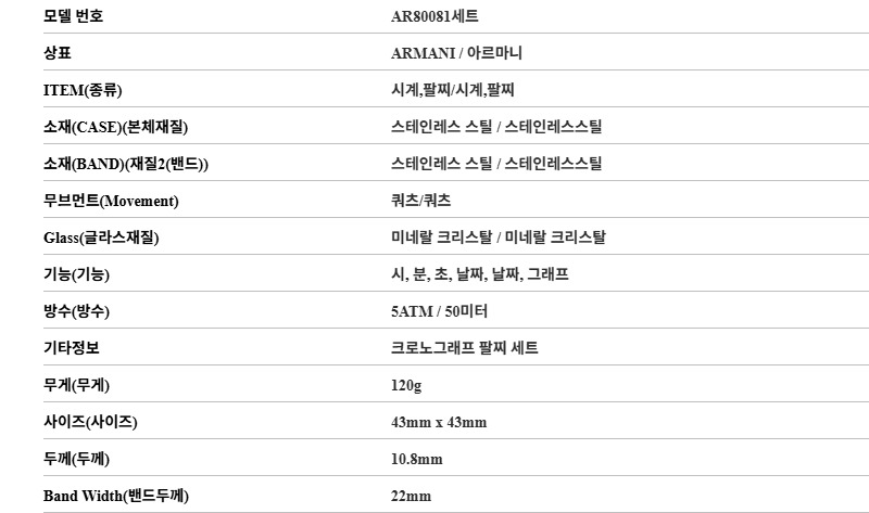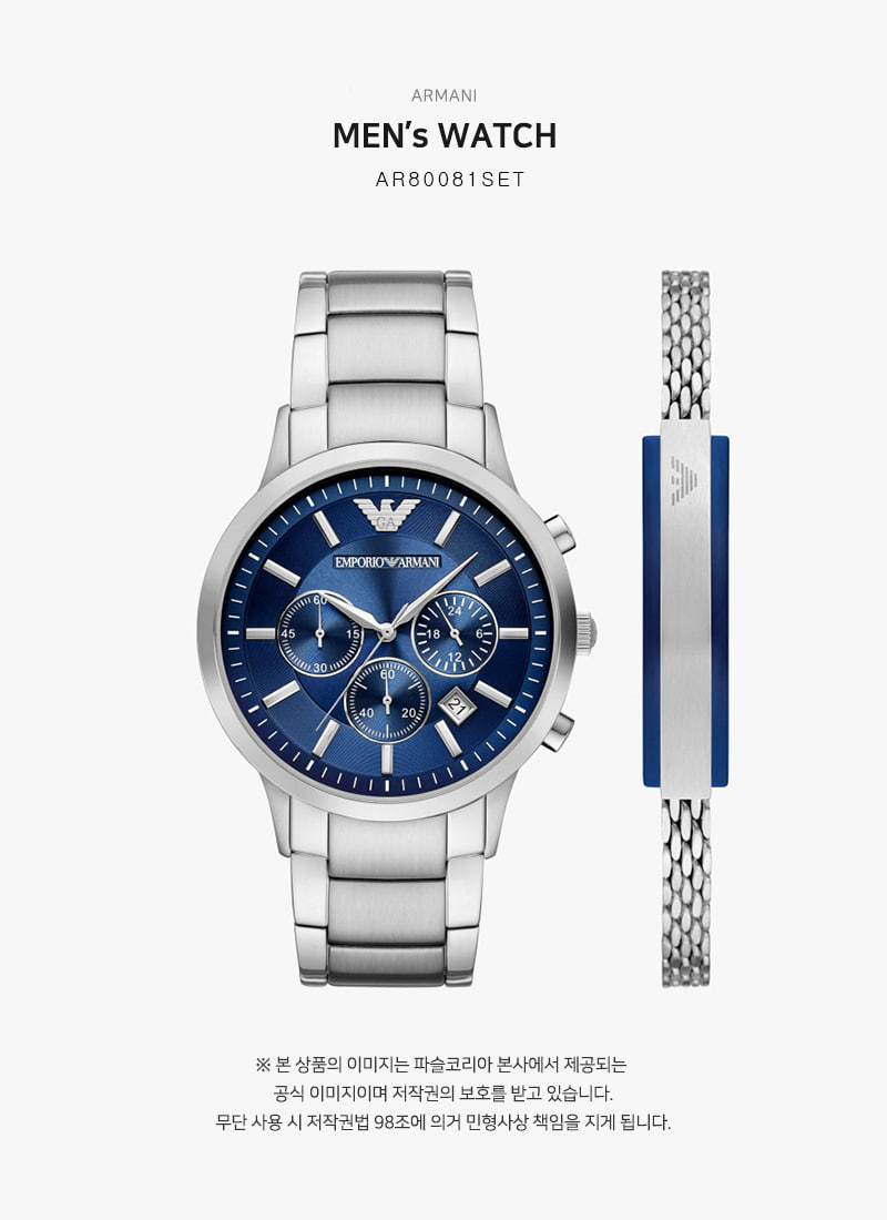 엠포리오 아르마니 43mm 크로노그래프 브레이슬릿 세트 메탈 시계 블루 실버