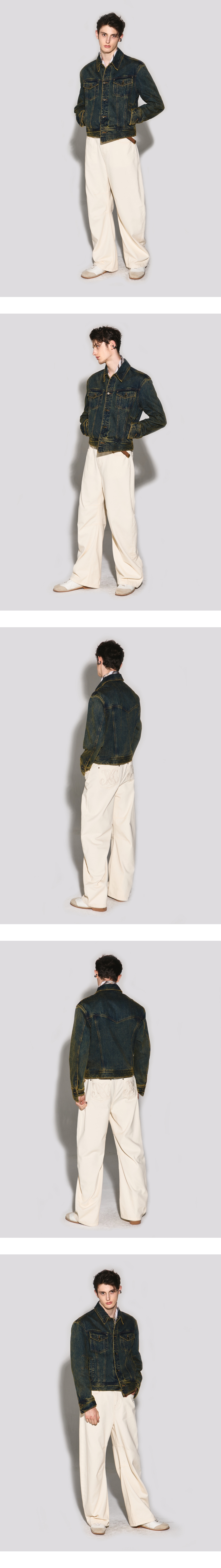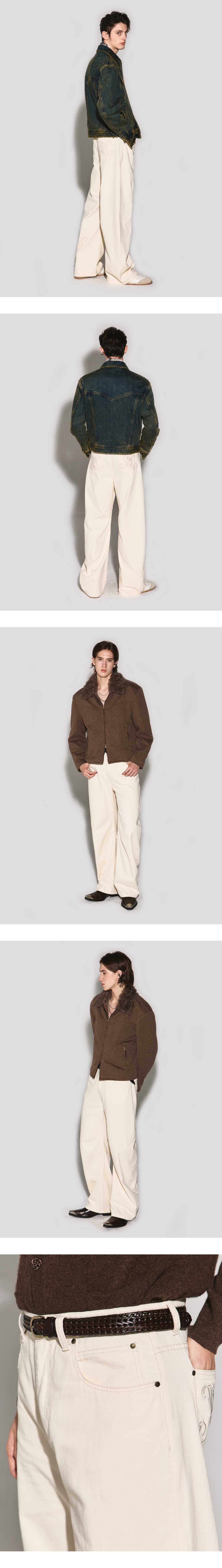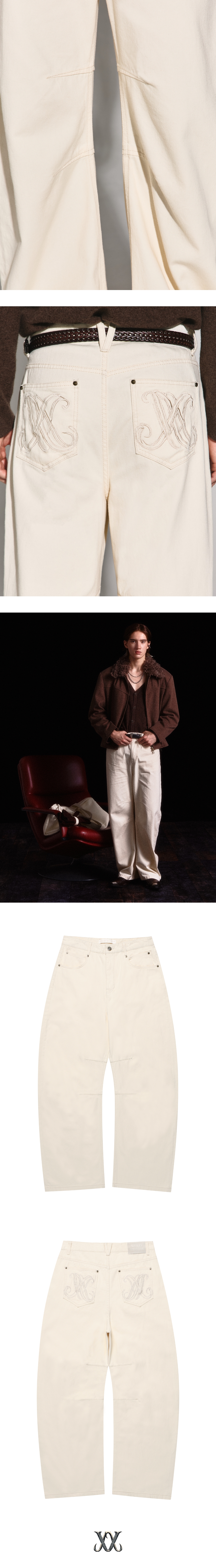 - 커브드 아웃심 디자인의 와이드 핏 데님팬츠 - 무릎 두 개의 다트 디테일로 커브드 실루엣 강조 - 뒤포켓 고급스러운 로고 자수 스티치 포인트 - 뒤 중심 허릿단 V 모양 벨트고리 디테일 - 흑니켈 로고 각인 금속 캔톤, 리벳 사용 - 웨슬리 휴스턴 로고 스웨이드 텍션지 마감 - DRY CLEAN or WASH SEPARATELY