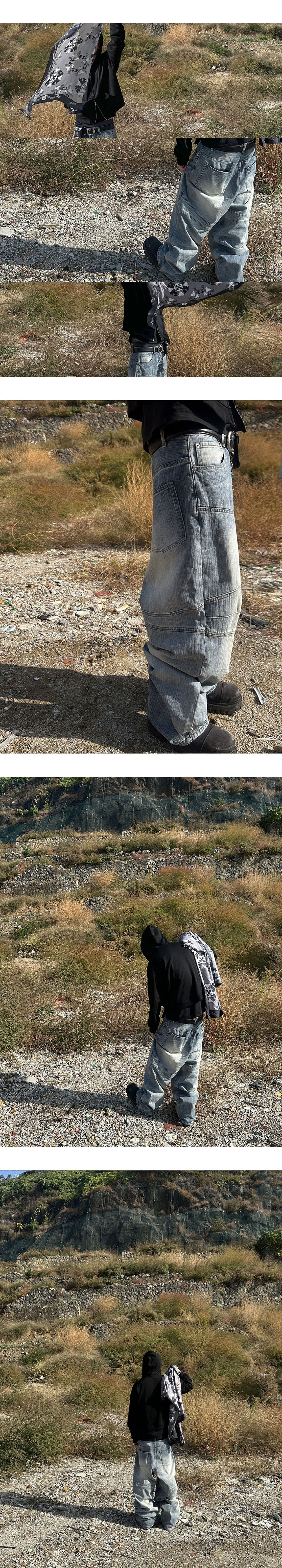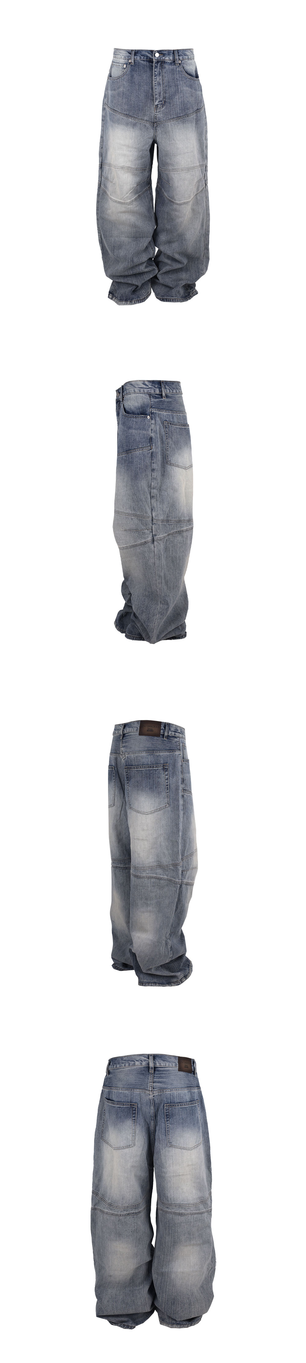 Description BLUE WIDE BIKER JEANS Blue Denim 원단 자체 실링으로 슬럽/white 틴 워싱 균형감 있게 제작되었습니다 Knee Detail 17OZ Heavy HEM / POCKET Damage Fabric Material Denim Cotton