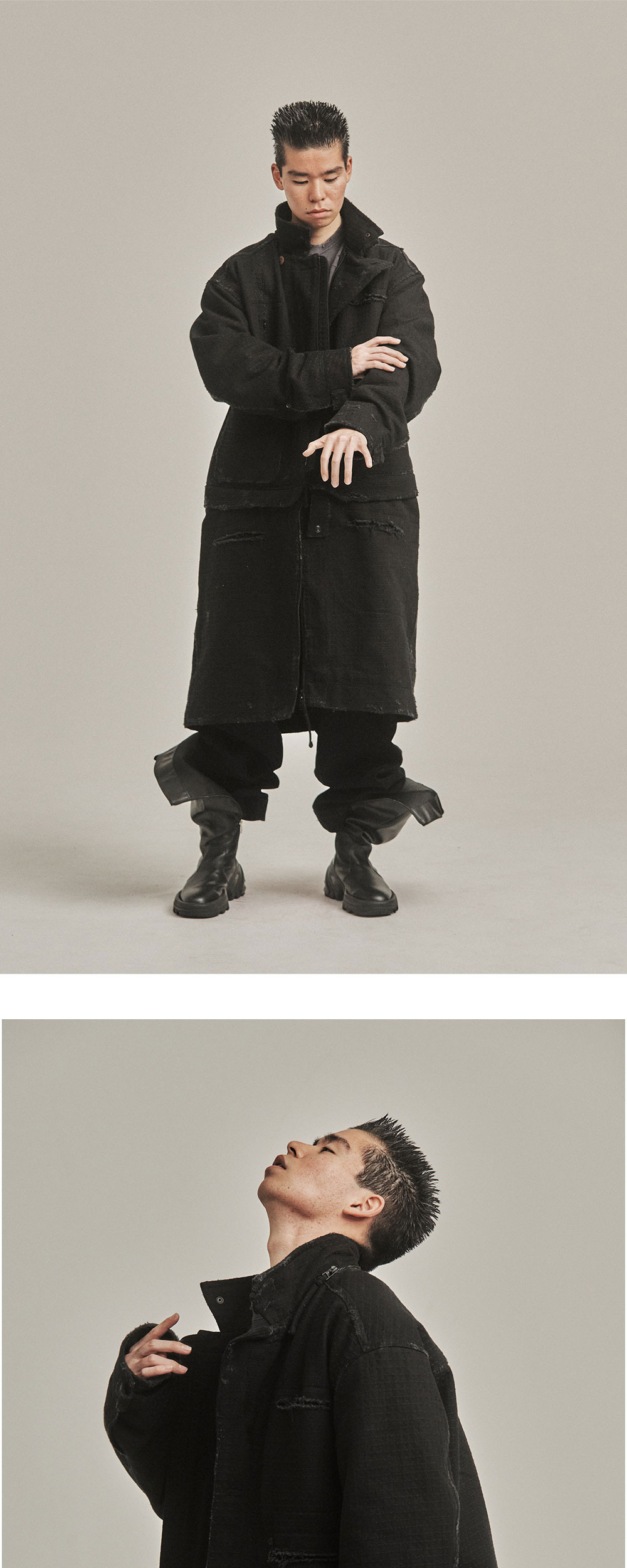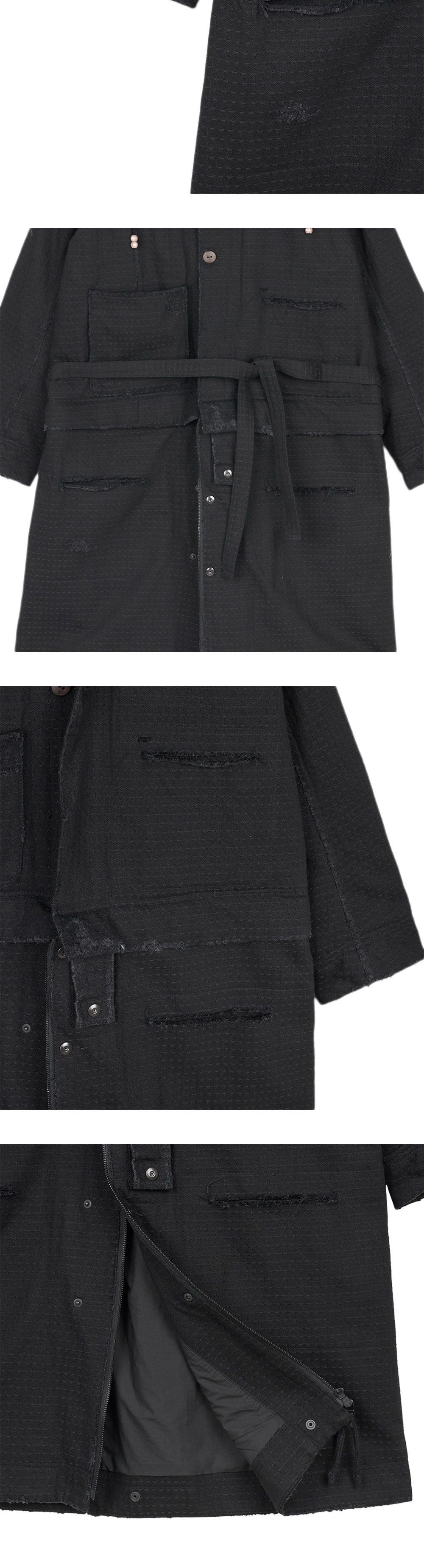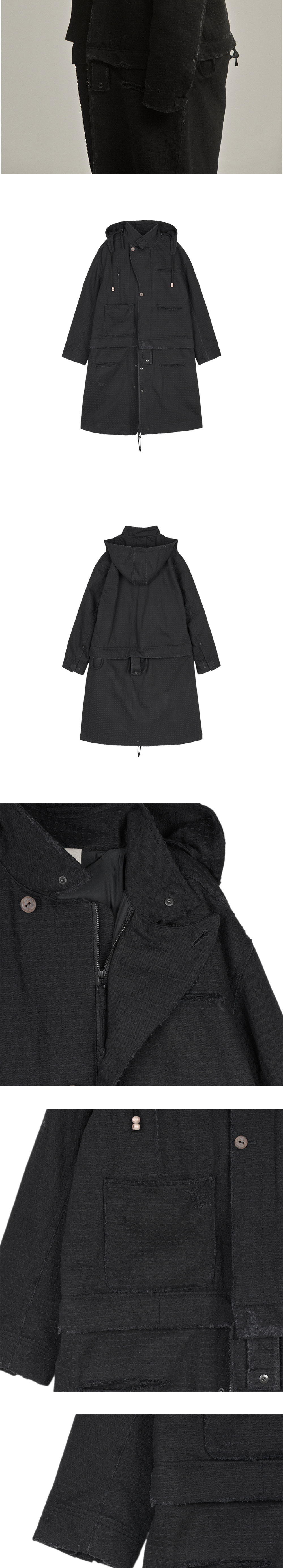 지안 예 MMTR 코트 블랙입니다. - 스커트 분리 가능한 2WAY 실루엣 - 하이넥 구조 - 후드 탈착 가능 - 러프한 마감 디테일 - 스트링으로 실루엣 조절 가능