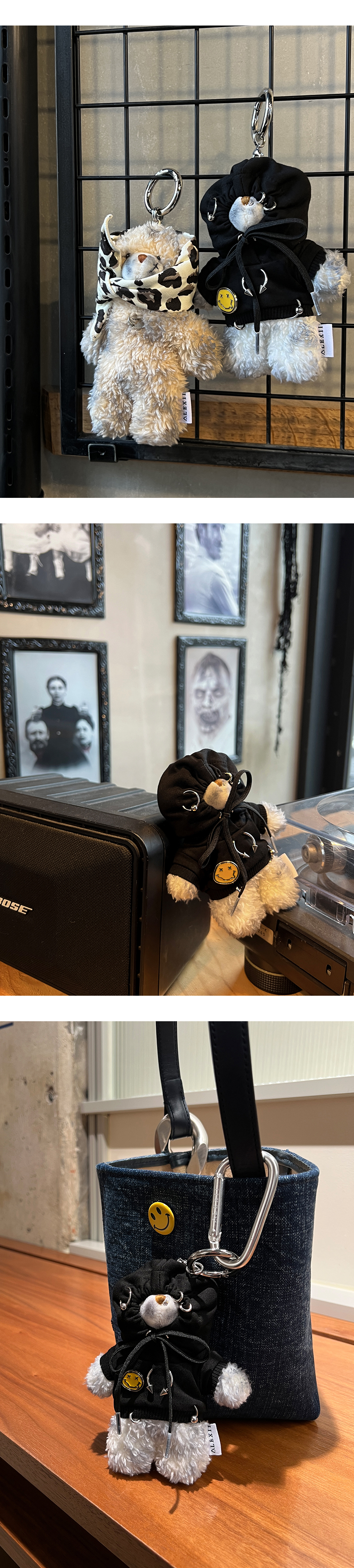 [ALEXII] PIERCING SMILE HOODIE BEAR 녹이 슬지 않는 SURGICAL 소재의 피어싱과 스마일뱃지가 포인트인 후드를 입고 있는 곰돌이 키링입니다. 머리 위쪽에는 후드를 벗을 수 있도록 열리는 고리를 연결해두었습니다. 곰돌이의 털부분은 핸드메이드로 더티가공 작업되었으며 특성상 개체마다 차이가 있을 수 있습니다. - HOODIE : COTTON 100% - PIERCING : SURGICAL STEEL - BEAR : POLYESTER 100% - SILVER-TONE METAL HOOK CLOSURE - MADE IN CHINA (base doll body) - HAND-CRAFTED & CUSTOMIZED IN KOREA (후가공/커스텀: 베이스가 되는 인형 몸판 제작 외 모든 공정은 한국에서 핸드메이드로 제작됩니다.) - HAND MADE 더티가공 제품으로 개체 차이가 있으며 교환, 환불 사유가 되지 않습니다.