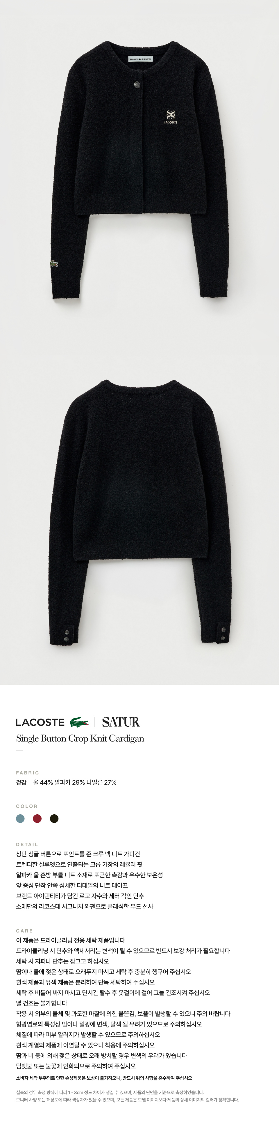 라코스테 X 세터 우먼 싱글 버튼 크롭 니트 가디건 블랙