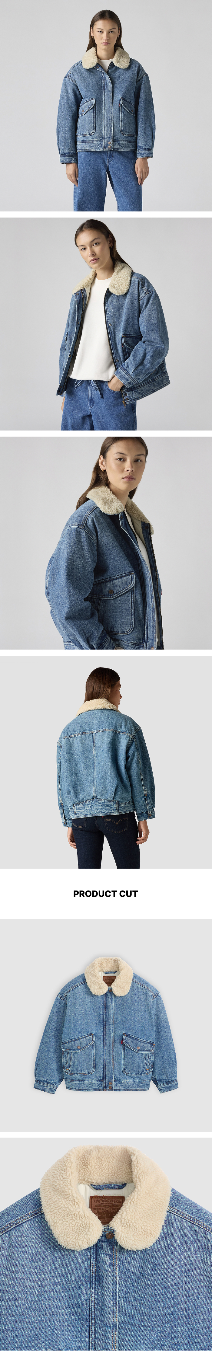 Levi's의 쉐르파 봄버 자켓입니다. 데일리 봄버 재킷에 따뜻함을 더한 아이템입니다. 루즈 핏으로 편안하게 착용할 수 있으며 보온성을 높일 수 있는 디테일을 추가하였습니다.