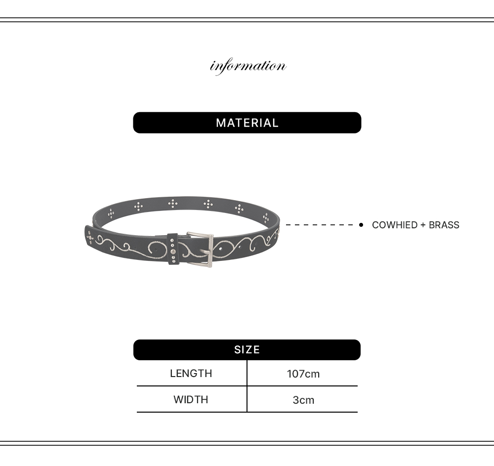 자수 디테일과 플라워 모티프가 조화롭게 어우러진 스웨이드 자수 벨트입니다. 메탈릭한 플라워 장식이 더해져 보헤미안 무드를 한층 높여주며, 다양한 룩에 포인트 아이템으로 스타일링하기 좋습니다. *주의사항 스웨이드 소재 특성상 물기·마찰에 주의해 주세요. 금속 장식은 습기 및 변색에 취약하니 보관 시 유의 바랍니다.