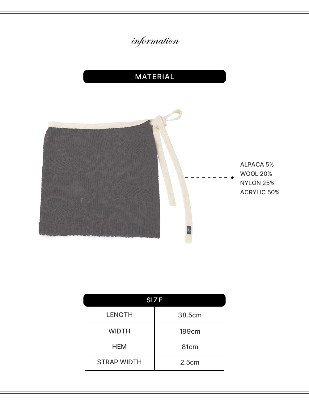 팬츠와 함께 레이어드해 스타일링할 수 있는 스커트입니다. 유연한 실루엣의 니트 조직에 말 모티프의 헤라시 짜임으로 포인트를 더했으며, 배색 스트랩 디테일이 경쾌한 무드를 완성합니다. -제품 손상을 최소화하기 위해 드라이클리닝을 권장드립니다. -의류 건조기 사용 시 제품 수축 및 변형의 우려가 있습니다. -소비자의 부주의로 인한 제품 손상 및 훼손은 보상 대상에서 제외됩니다.