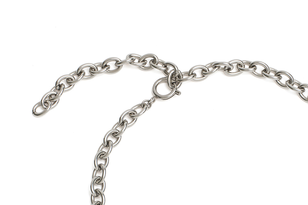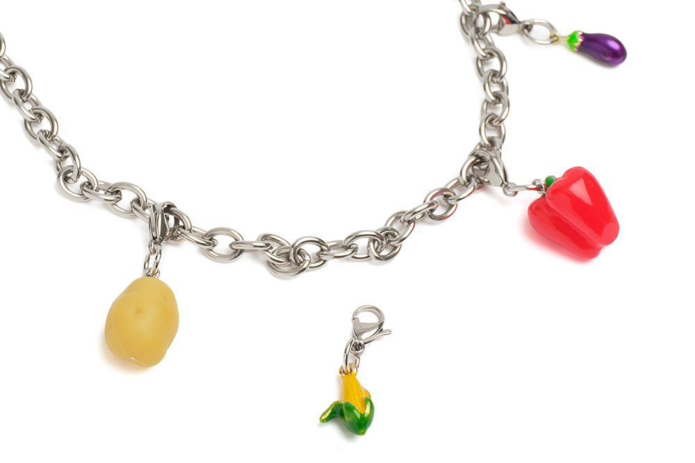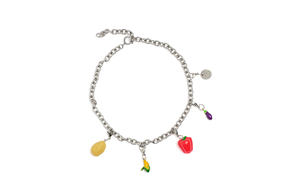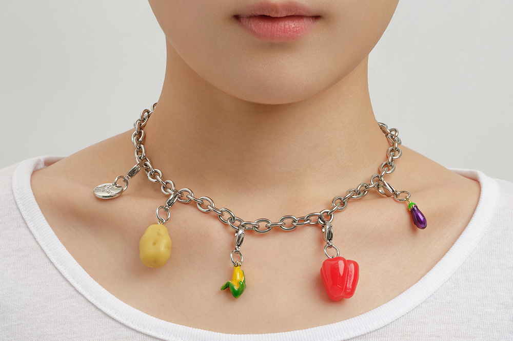 여러 채소 모양의 참이 포인트인 목걸이입니다. 볼드한 실버 체인과 누핍 로고 펜던트, 다양한 색감의 채소 오브제로 위트 있는 룩을 완성해 보세요.