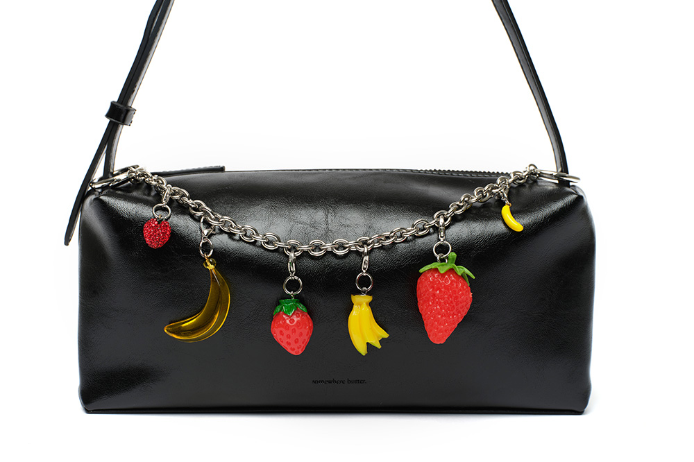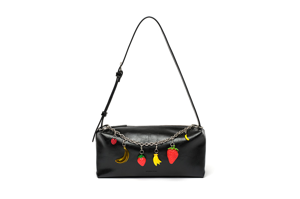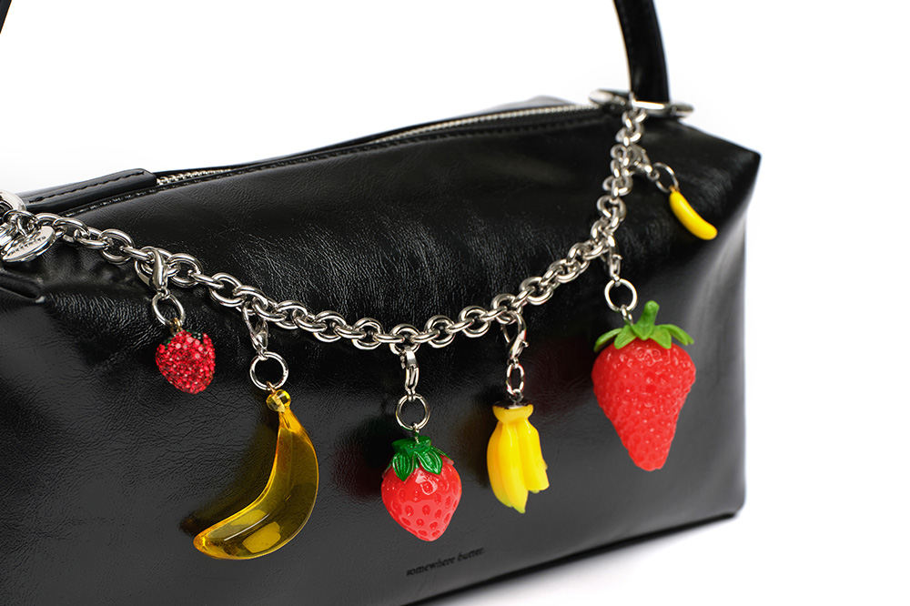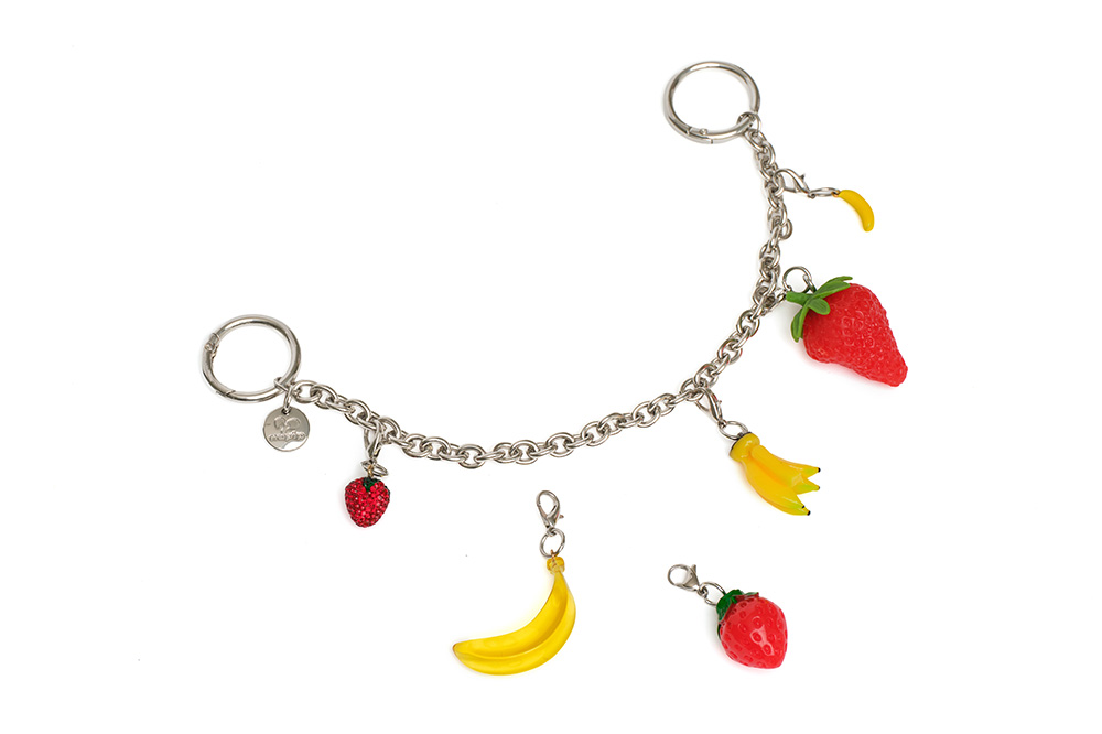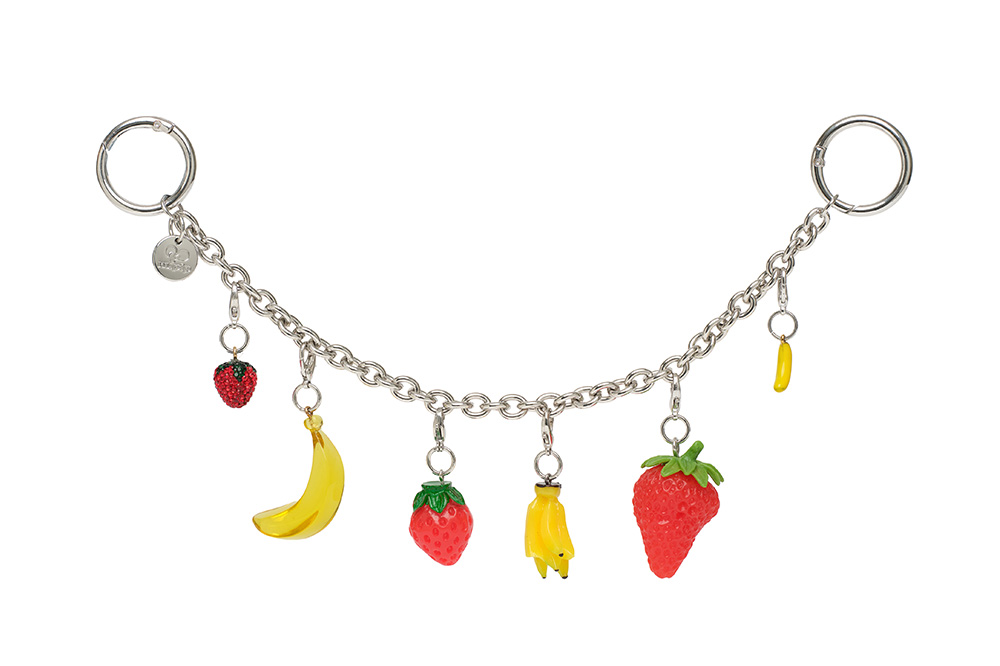 바나나와 딸기 모양의 참이 달린 키체인입니다. 여러 형태의 오브제와 실버 로고 펜던트로 유니크한 분위기를 더해보세요.