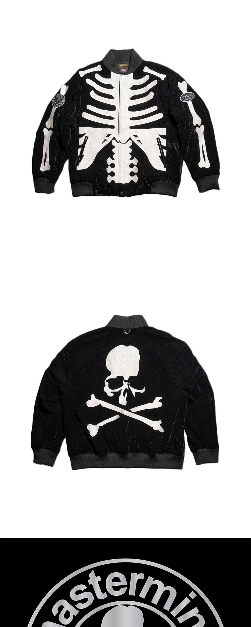 마스터마인드 x 밴슨 블루종 블랙입니다. - 블랙 봄버 자켓 - 스켈레톤 디자인 - 스냅 단추 여밈 - 콜라보 로고 패치