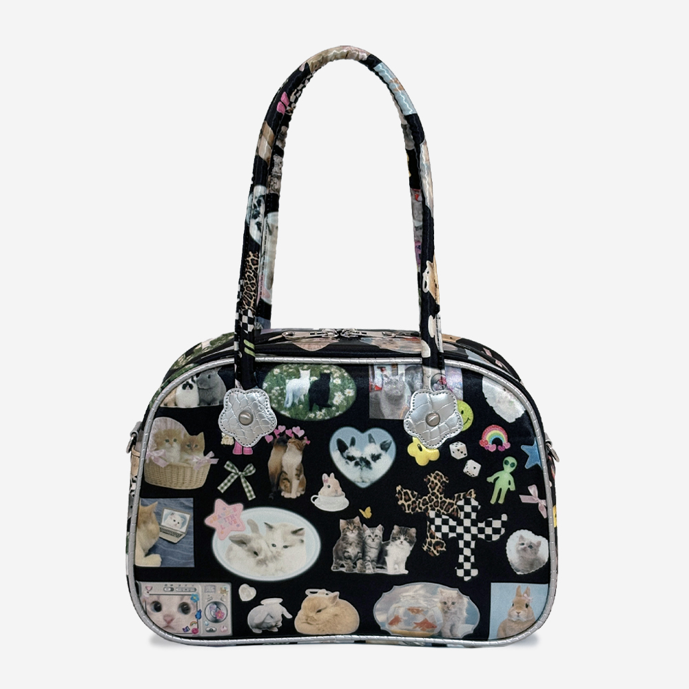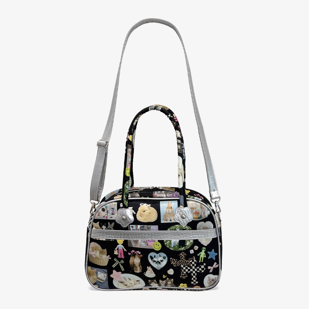 COLLAGE TOTE BAG Metal Black [One Size] 31cm x 21cm x 9cm (1 out Pocket / 1 inner pocket) 1 Shoulder Strap. [Material] Poly & Cotton mixed. Vegan Leather. Metal. Made in Korea. 언스테디마켓 콜라쥬 토트백 블랙컬러웨이가 한정수량으로 제작되었습니다. 빈티지하고 치키한 디자인에 적당한 크기와 가벼운 무게로 시즌 구분없이 데일리백으로 추천드립니다. *탈부착 가능한 가죽스트랩이 추가되었습니다. *콜라주 토트 백 구매 시, 하트키링(랜덤)을 선착순으로 드립니다.