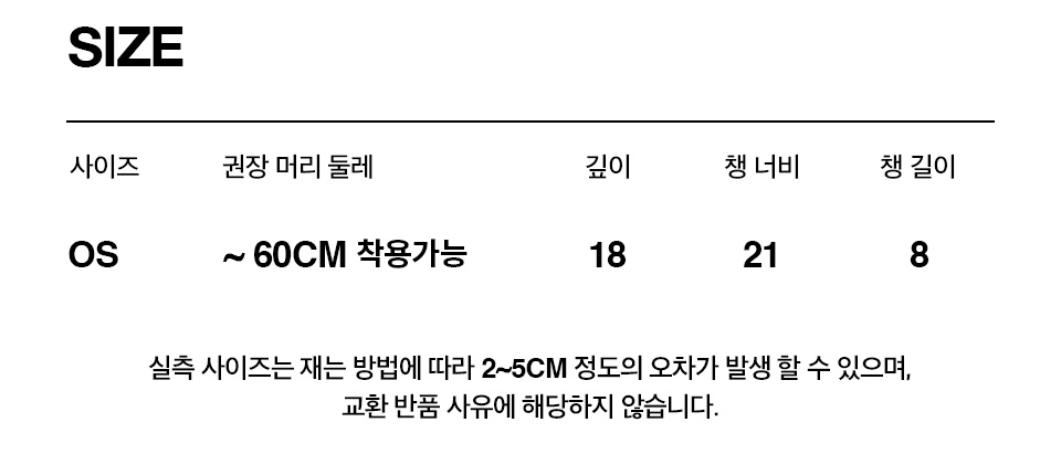 | 둘레 | 깊이 | 챙 너비 | 챙 길이 |