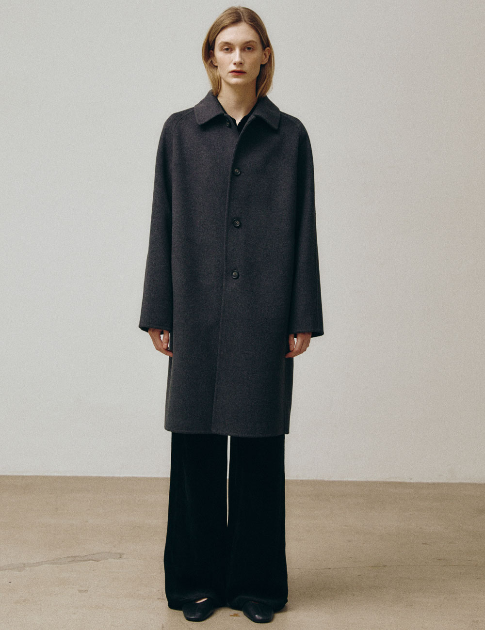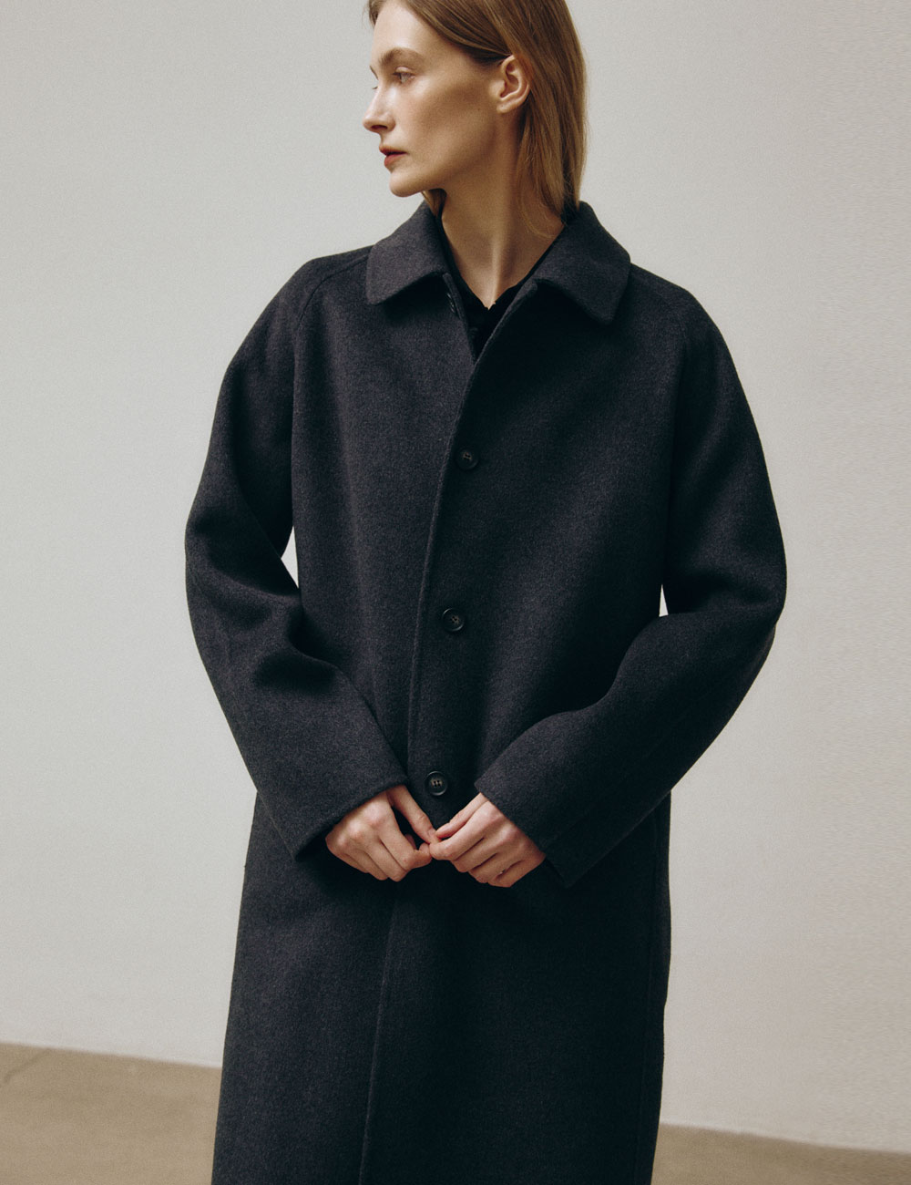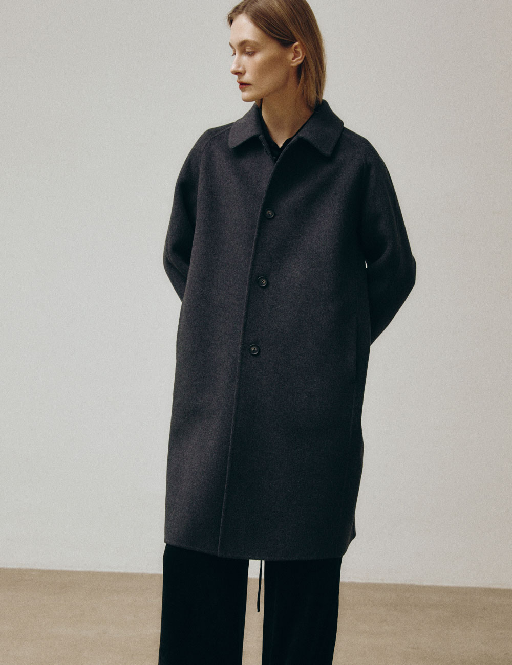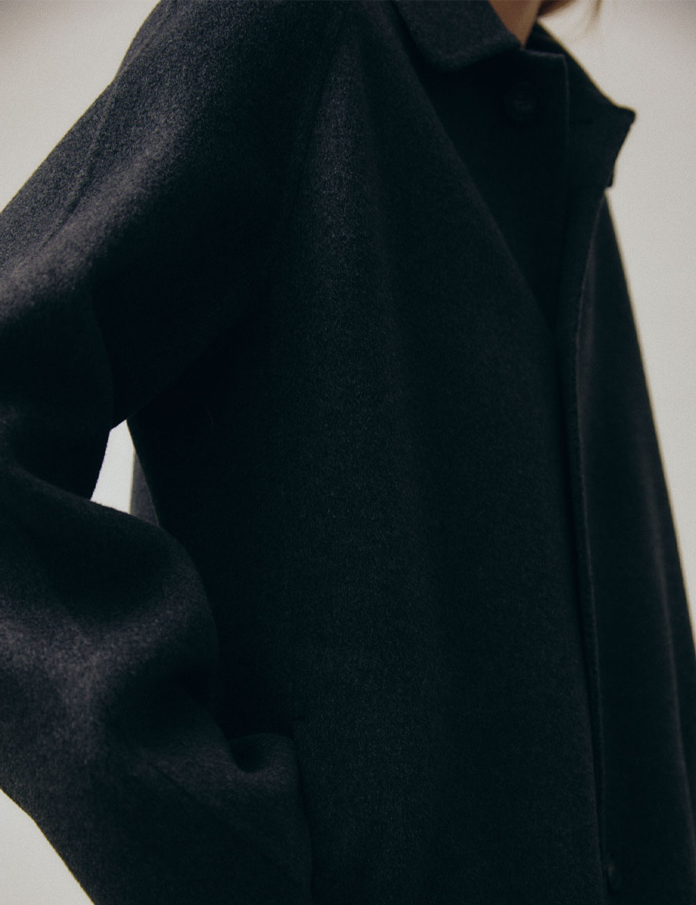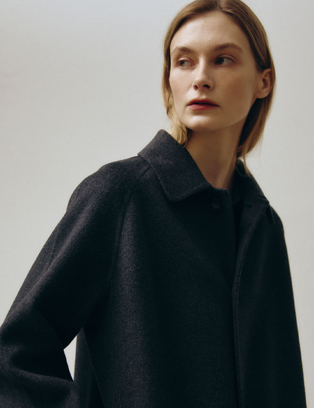 - 미디기장의 래글런 슬리브 핸드메이드 코트 - 캐시미어 혼방의 울 나일론 원단 - 스프레드 카라에 탈착식 버튼탭과 심라인 포켓 - 로고를 새긴 소뿔 단추 - 안감이 없는 디자인
