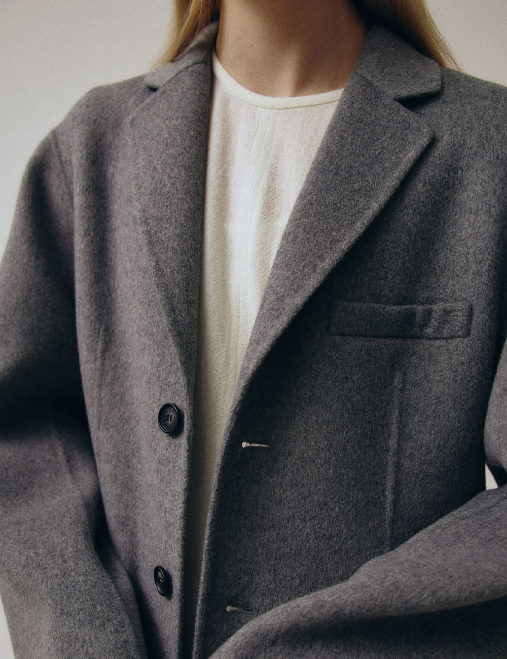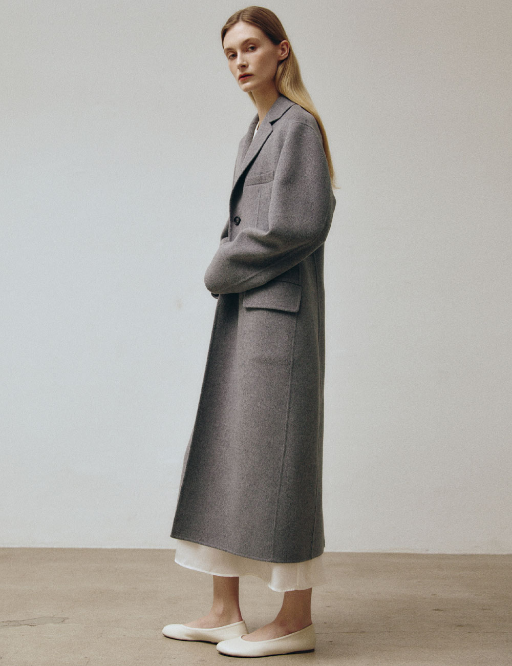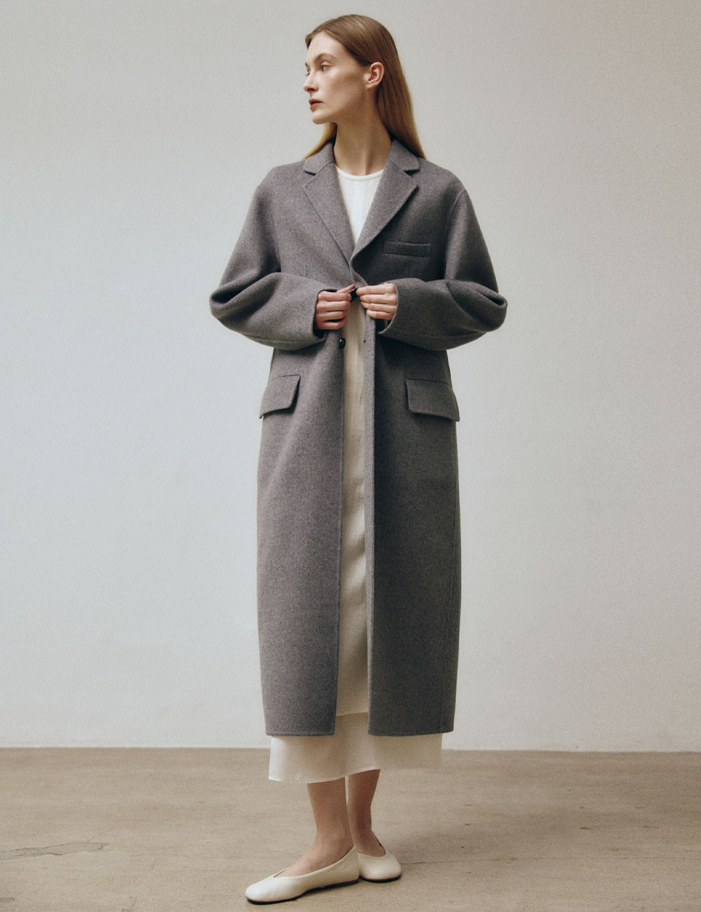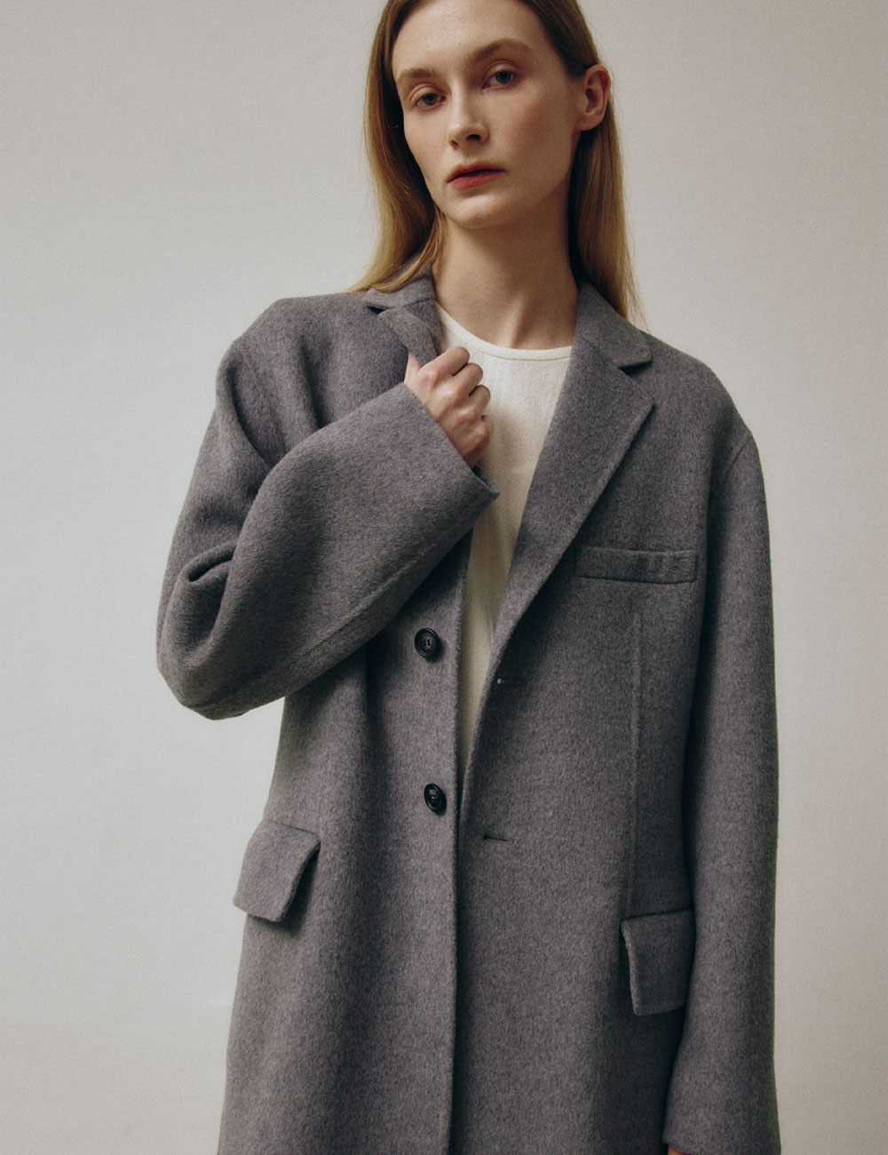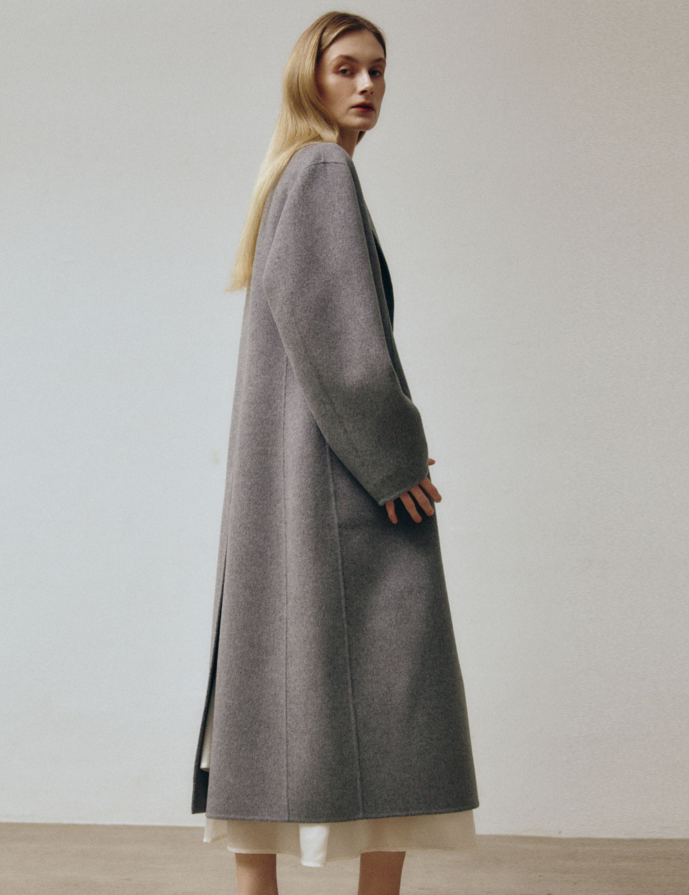 - 롱기장의 싱글 브레스트 핸드메이드 코트 - 캐시미어 혼방의 양면 울 원단 - 노치 라펠 및 드롭숄더 디자인과 뒤트임 - 허리라인이 드러나는 실루엣 - 가슴 장식 포켓 및 플랩 포켓 - 소매안감 사용