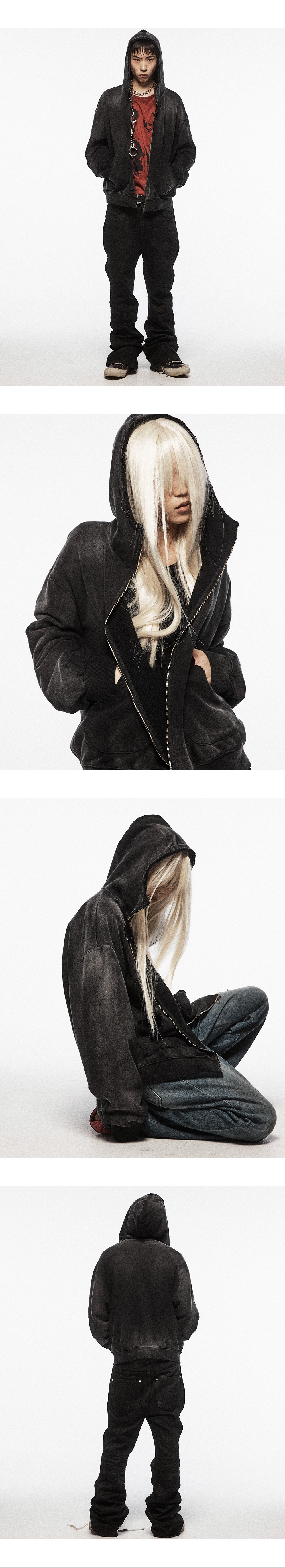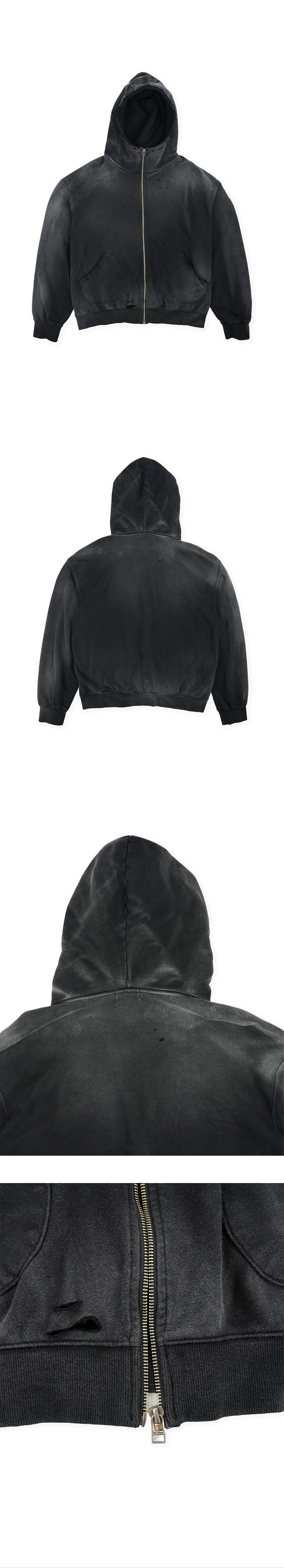 - 벨벳 질감의 프렌치 테리 원단 - 빈티지한 염색과 탈색 - 목을 가려주는 후드 패턴 - YKK 지퍼 - 전면부 원형 포켓 - 디스트로이드 및 커팅 디테일 * 가먼츠 다잉 제품으로 단독세탁 필수.