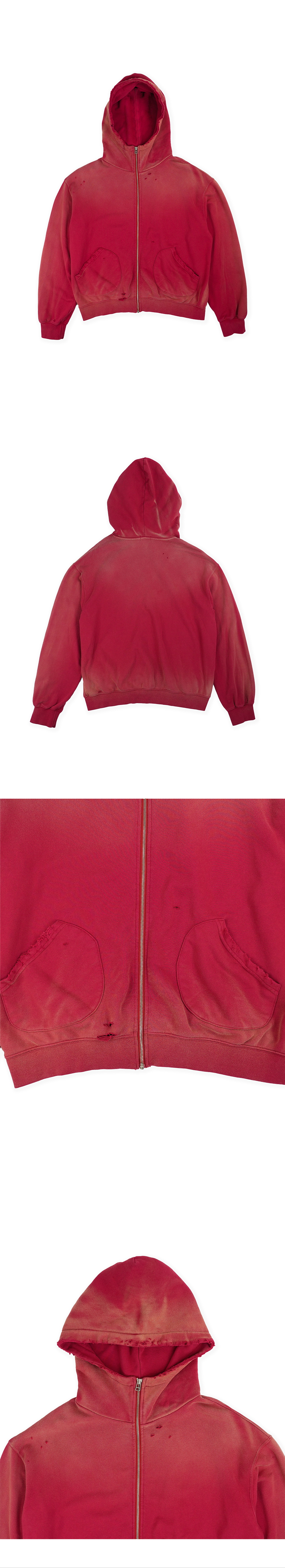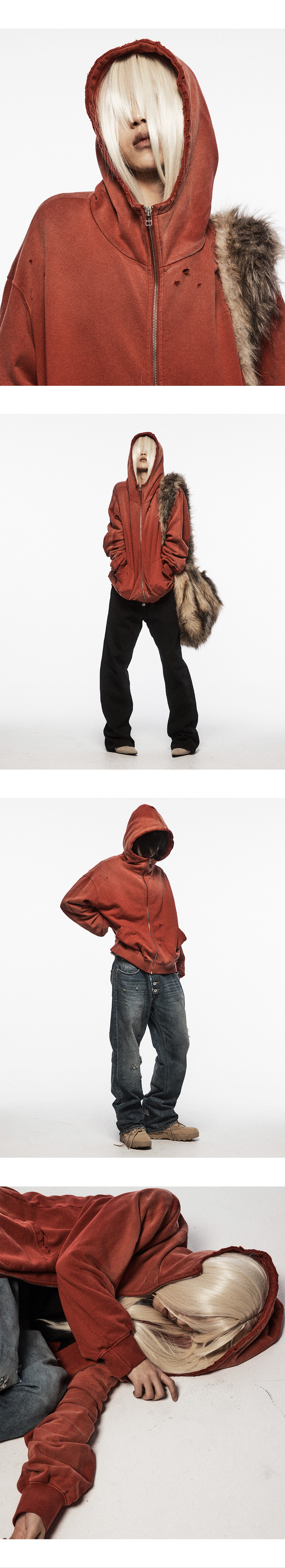 - 벨벳 질감의 프렌치 테리 원단 - 빈티지한 염색과 탈색 - 목을 가려주는 후드 패턴 - YKK 지퍼 - 전면부 원형 포켓 - 디스트로이드 및 커팅 디테일 * 가먼츠 다잉 제품으로 단독세탁 필수.