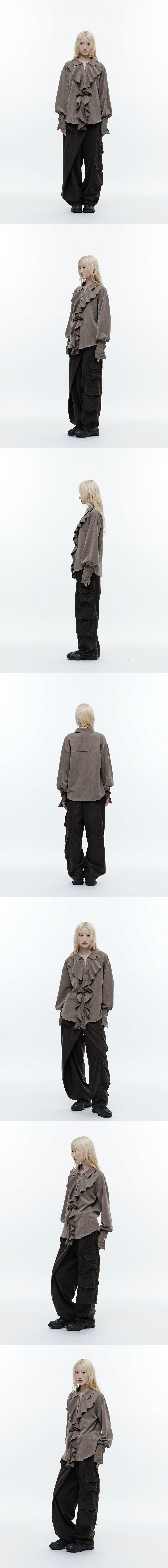 POLYESTER 75% RAYON 20% POLYURETHANE 5% 총장 69cm, 어깨 53cm, 가슴 50.5cm, 소매 65.5cm, 밑단 52cm * 상세 사이즈는 단면 기준이며, 측정 방법과 위치에 따라 1~3cm 오차 범위가 생길 수 있습니다. * 모델(174cm) 피팅 사이즈 / OS 로우 엣지 러플 디자인 싸개 단추 디테일 턱 디테일 드레이핑 실루엣 커프스 버튼 클로징 루즈핏