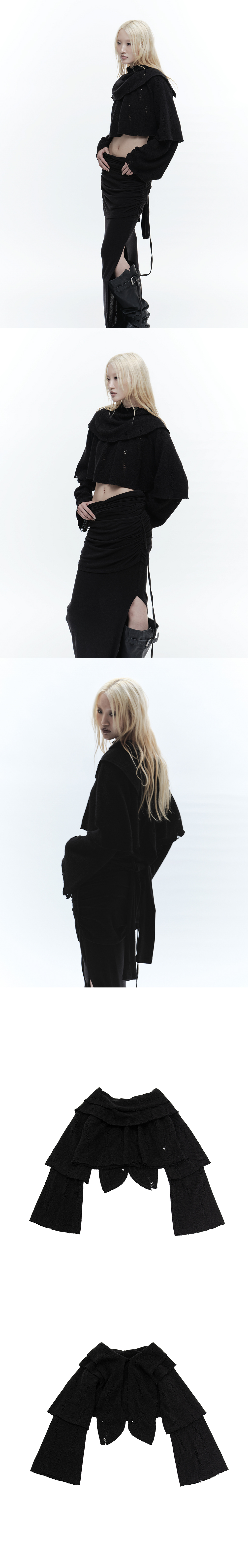 ACRYLIC 80% NYLON 20% 총장 36.5cm, 가슴 55cm, 소매 69cm, 밑단 63cm * 상세 사이즈는 단면 기준이며, 측정 방법과 위치에 따라 1~3cm 오차 범위가 생길 수 있습니다. * 모델(174cm) 피팅 사이즈 / OS 레이어드 넥, 슬리브 디자인 다양하게 연출 가능한 더블 넥 디테일 플레어 소매 로우 엣지 마감 데미지 디테일 플레어 슬리브 디자인 루즈핏